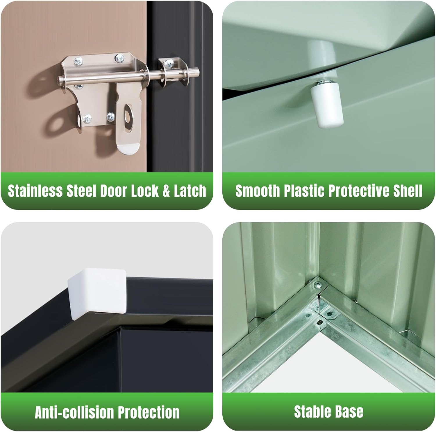 - Metal Storage Shed: The thick metal support roof and laminated wall panels make the entire structure more stable and can easily handle snow and rain.