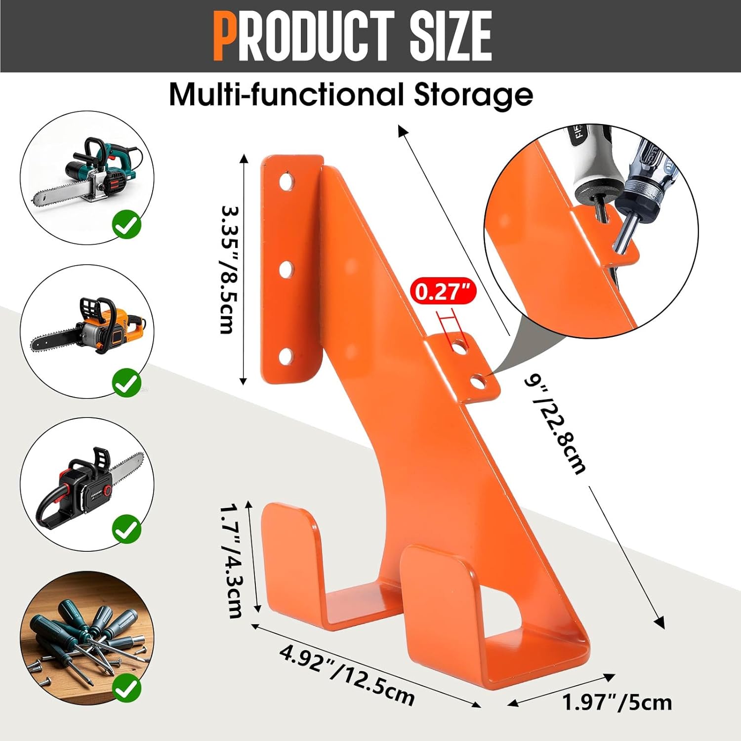 - ORGANIZE YOUR SPACE: Easy to install wall mounted chain saw bracket, fix your saw with this sturdy wall mounted bracket, greatly improve the storage space in your garage, shed, store or workshop. Especially for chain saw storage in a small workshop or tool room.
