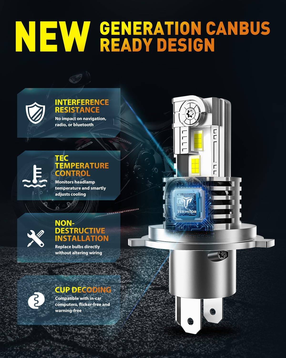 - 1:1 Mini Size for Quick Installation: The Termitor H4/9003/HB2 Motorcycle drving light bulb features a plug-and-play design, allowing installation in just 3 minutes. With an IP68 waterproof, dustproof, and cold-resistant rating (-50℉ to +350℉), it’s built to perform in any weather condition, ensuring worry-free use year-round