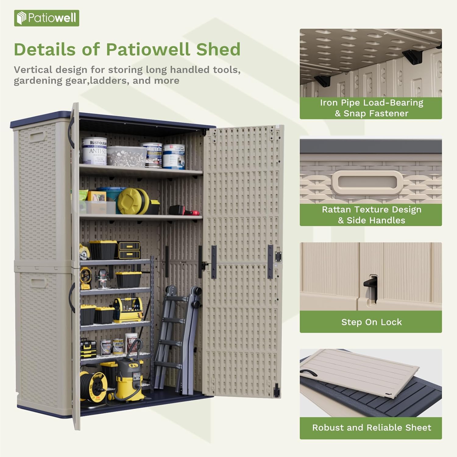 Patiowell 50 cu.ft Plastic Outdoor Storage Shed, Lockable Waterproof Resin Storage Cabinet Vertical Storage Shed for Garden Tools, Garbage Cans, Pool Supplies, Beige(Not Include Shelves)