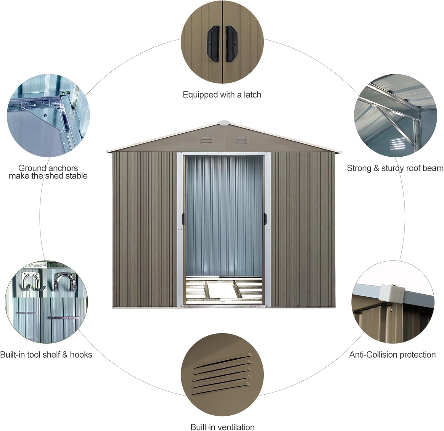 - ๐ก๐๐ฅ๐ฅ-๐ฐ๐๐๐ญ๐ก๐๐ซ ๐๐ญ๐จ๐ซ๐๐ ๐ ๐๐ก๐๐: Our metal shed 6x8 features sliding doors that open and close smoothly, with handles and a heavy-duty lock for added security. It serves not only as a safe space for storing garden tools but also as a warm pet house. The sloped roof of the storage building effectively prevents leaks and snow accumulation, while the four integrated punched vents improve airflow, helping to keep your items dry.