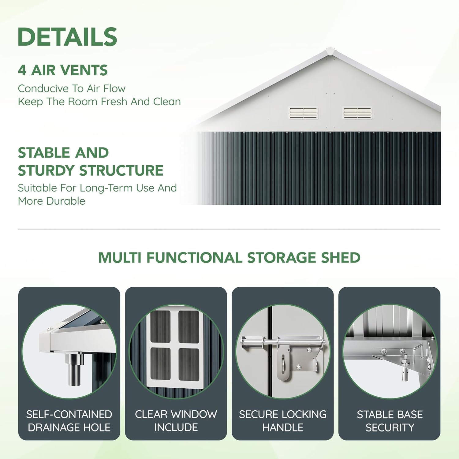 - Enhanced Durability: Constructed from high-quality galvanized steel, this storage shed is designed to withstand the elements. The frame floor adds extra stability, ensuring your shed stands strong against wind and weather.