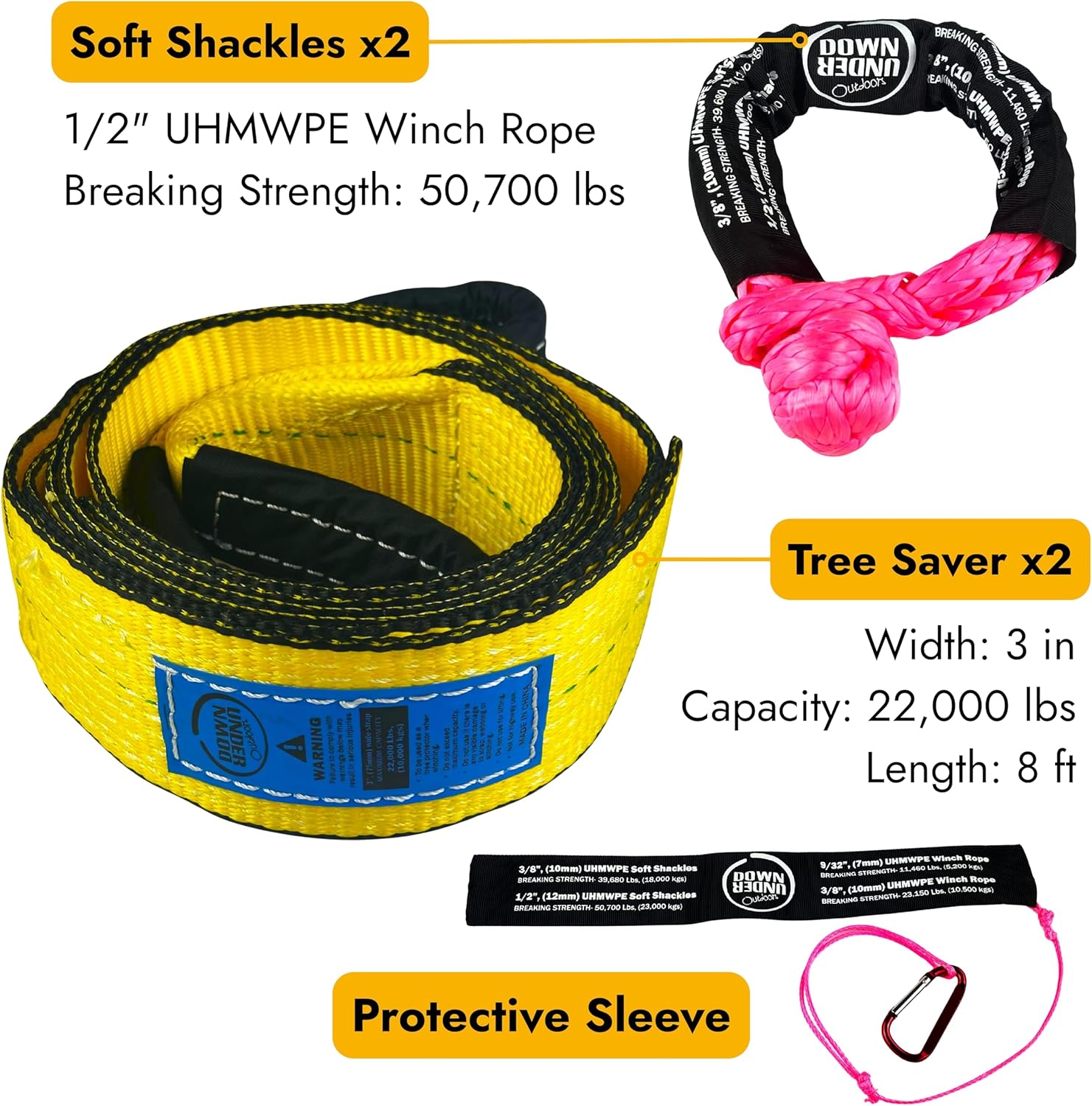- RECOVERY KIT ALSO INCLUDES 2 tree savers, 2 soft shackles, 2 snatch rings, 2 figure 8 rings and accessory carry bag