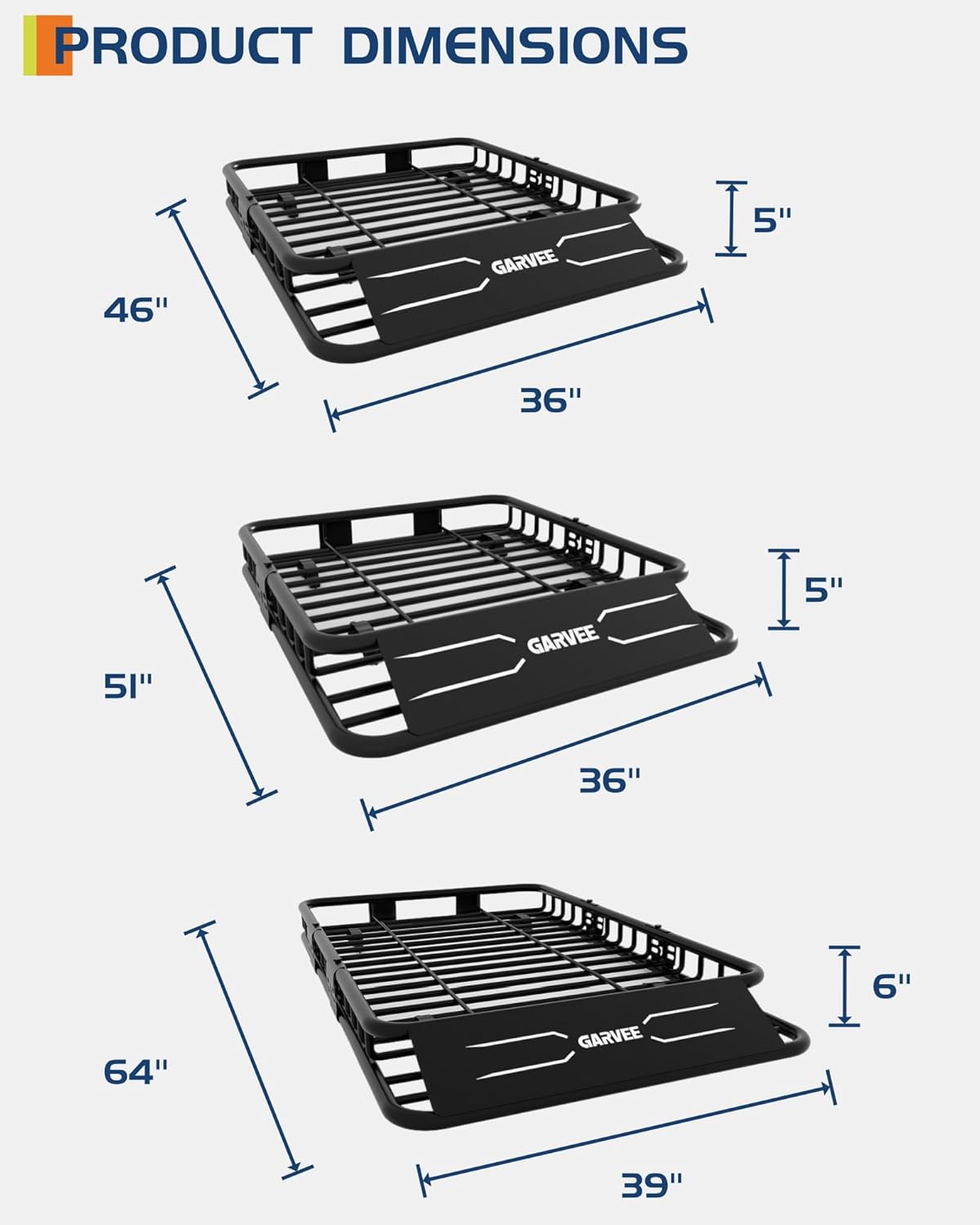 - ăLARGE STORAGE CAPACITYăFree up space in your vehicle with this roof rack cargo basket that can hold up to 200 Lbs. Overall dimensions include: 64"(L) x 39"(W) x 6"(H)
