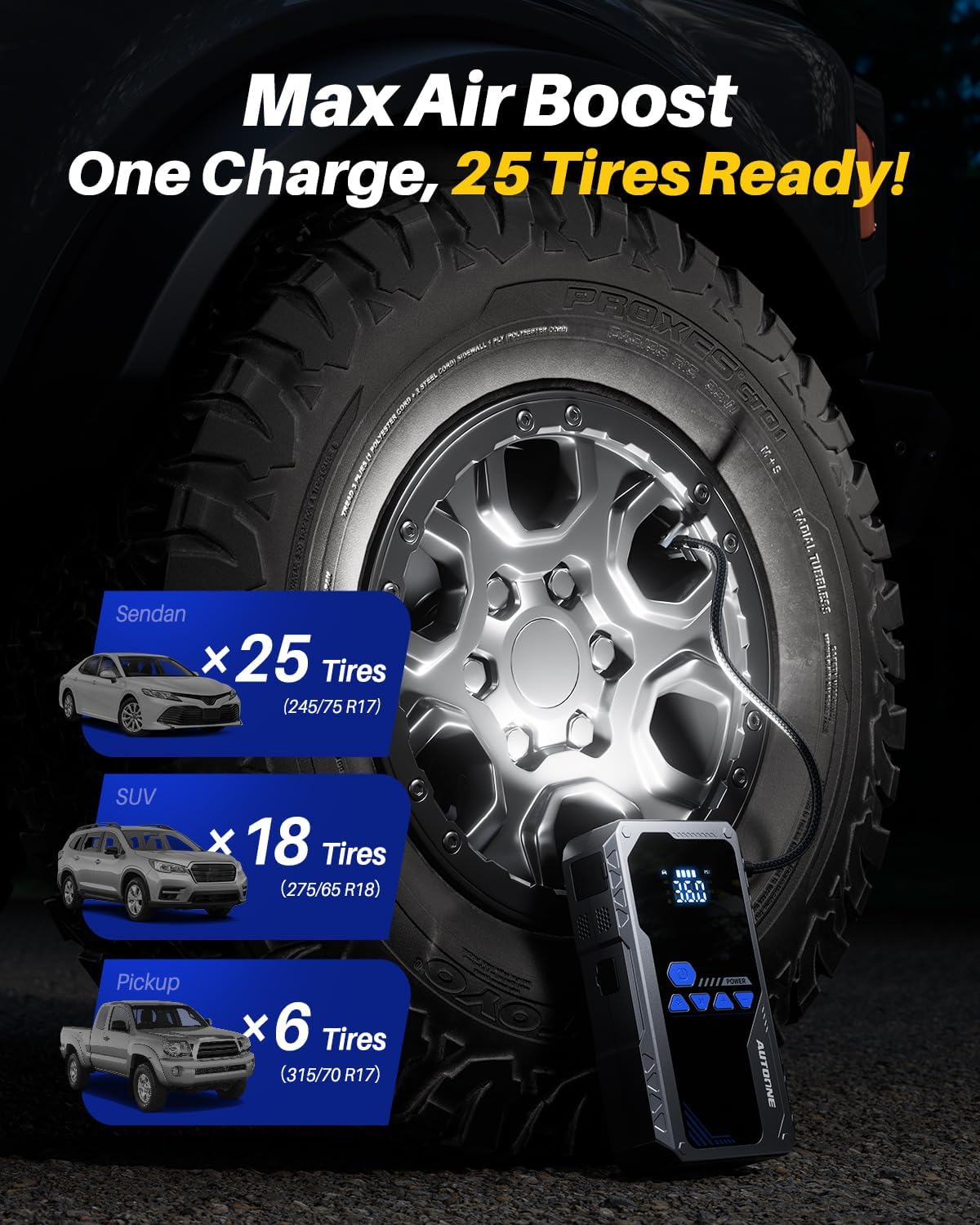 - ăHigh-Performance Air CompressorăIntegrated with a high-performance air compressor, this jump box for car battery inflates tires for cars, motorcycles, bicycles, and more at 45 liters per minute. It quickly boosts tire pressure, such as inflating a pickup truck tire from 30PSI to 36PSI in just 2.5 minutes, ensuring optimal tire performance on the go. This versatile car jump starter with air compressor meets all your inflation needs.