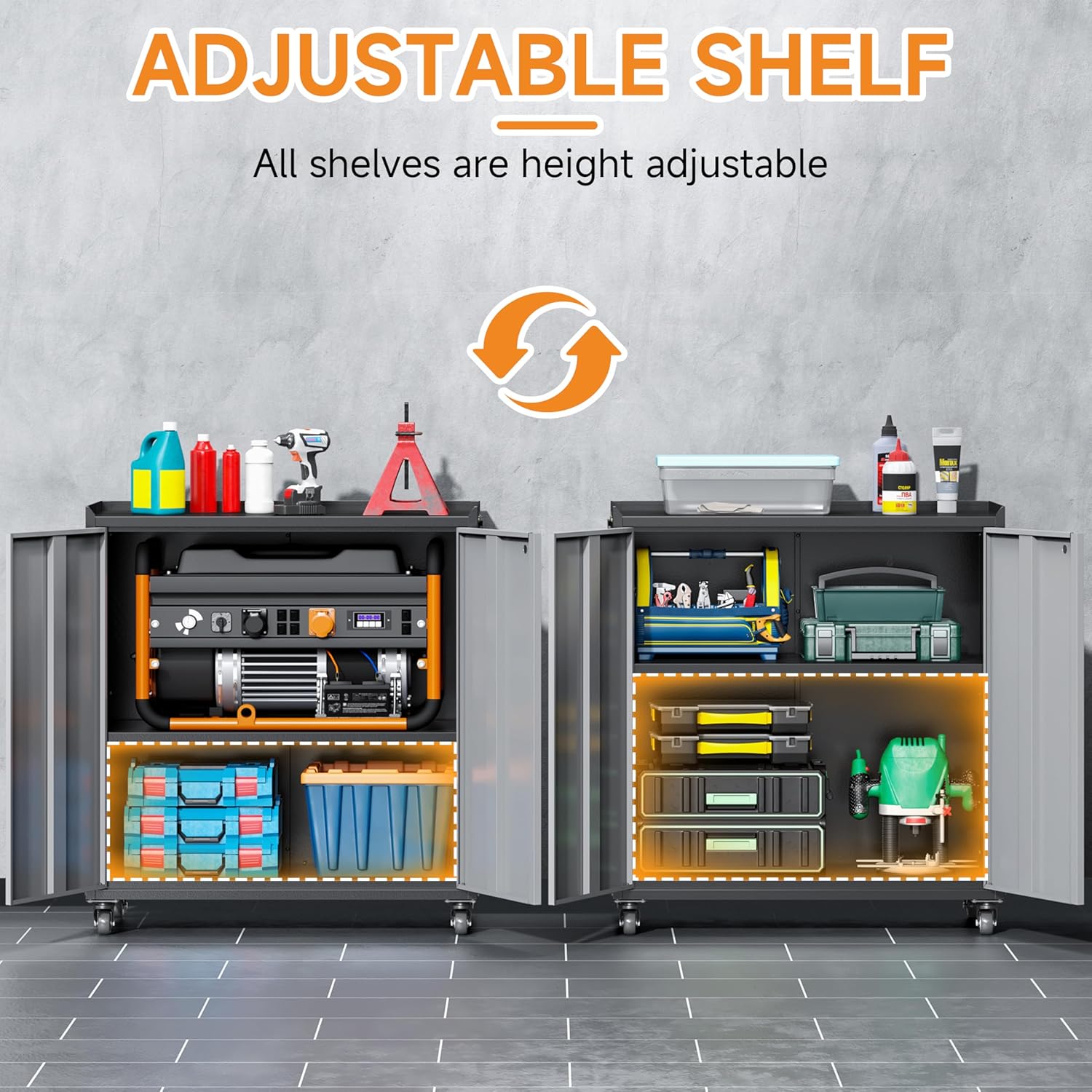 Metal Garage Storage Cabinet with Wheels, Adjustable Rolling Tool Storage Cabinet with Lock, 34" Steel Locking Tool Cabinet with Doors and Shelves for Garage, Warehouse (Black&Gray, 34.3" H)