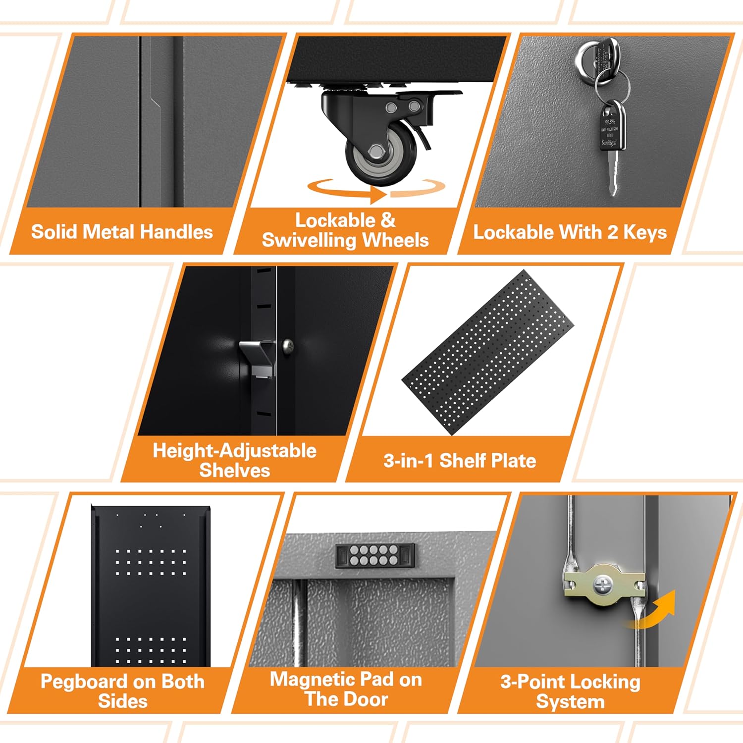 - đ§âđ§ăEffortless Mobility and Easy AssemblyăWith four 360-degree swivel casters that can be locked when not in motion, this garage cabinets with wheels is easy to move around yet stable when needed. The included assembly instructions clearly illustrate each component and step, along with an assembly video for reference, enabling one person to complete the setup in approximately 40 minutes.