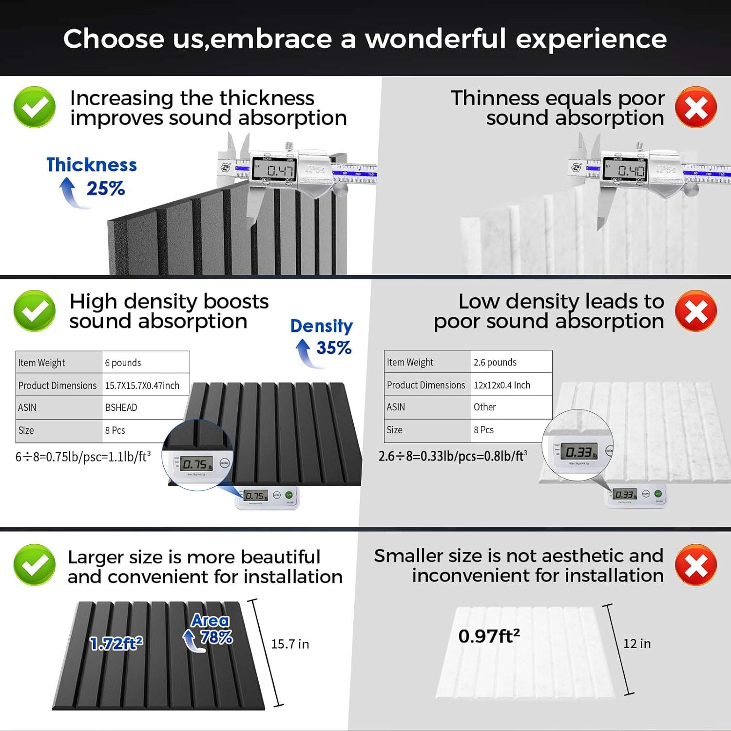 - 【Excellent Quality】: This sound panels is made of high-quality 100% polyester, odorless and flame retardant. There are no risks associated with spending long periods of time in a room with soundproof wall panels. And compared with traditional sound panels noise reducing for walls, our products have higher thickness (25% thicker) and density (35% denser)larger in size(178% area),which means better durability and sound absorption