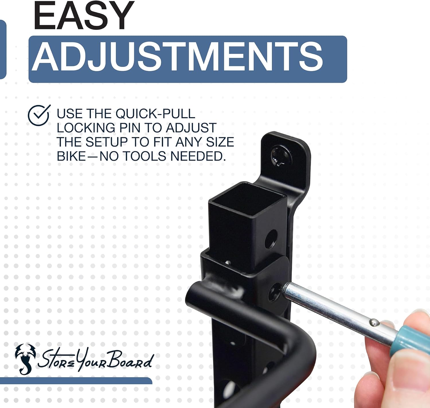 - Adjustable Design: The WheelRest is fully adjustable, making installation simple. It’s easy to change the hook height to fit various bike sizes without re-installing. Use the quick-pull locking pin to make adjustments, no tools needed.