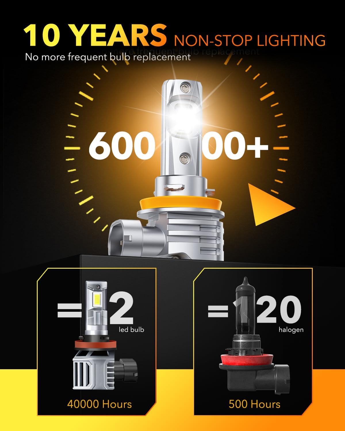 - 56,000 LUMEN AND 6,500K COOL WHITE: Illuminate the road ahead with unparalleled brightness using OXILAM H11 9005 LED bulbs combo. With high-grade CSP chips, these bulbs offer a staggering 700% brightness compared to halogen bulbs, ensuring a clear and focused beam for enhanced visibility during nighttime driving. Say goodbye to dim and blurry halogen bulbs
