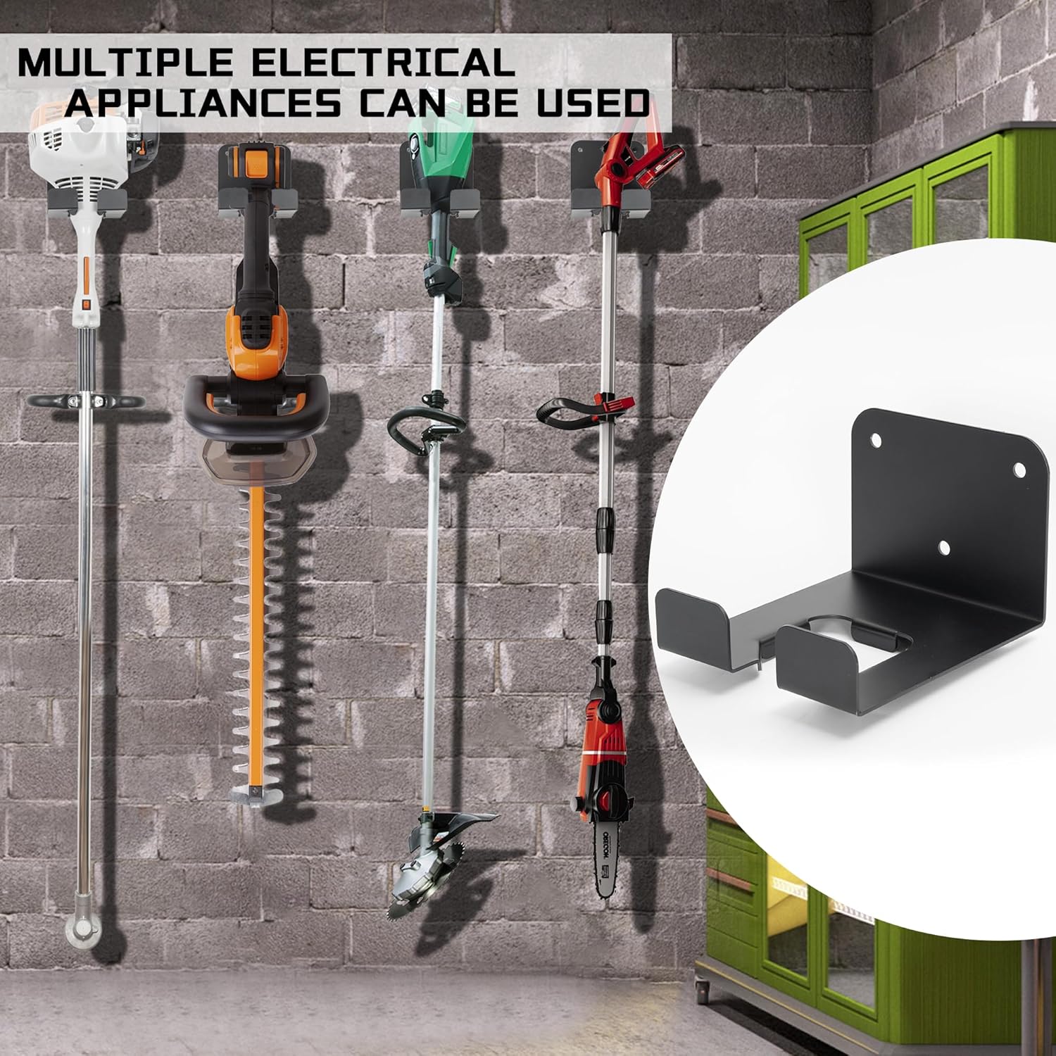 - 【Multipurpose Tool Hanger】The power tool hook is a flexible wall mounting solution, mount it in your garden, yard, shed or garage as you wish. Perfect for hanging various garden tools or power tools especially like string trimmers, weedeaters, power drills, gas edgers, chainsaws, blowers and lawnmowers, or garden tools like shovels, ladders, mops, brooms, hoses, snow shove, sports equipment, bicyclesor any hangable items, and work great.
