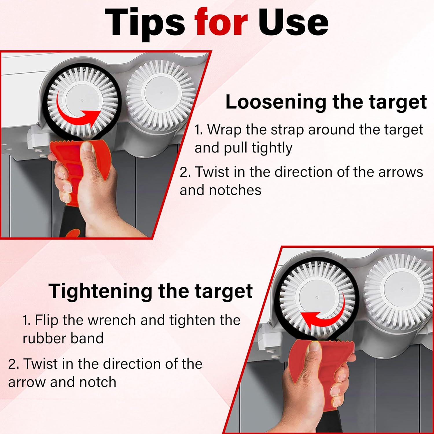 - Tips for Use: This strap wrench is easy to operate, simply wrap the strap around the target, thread through the handle and adjust to the proper diameter. To loosen the target, turn the wrench in the direction of the arrow; to tighten, flip the wrench over and repeat