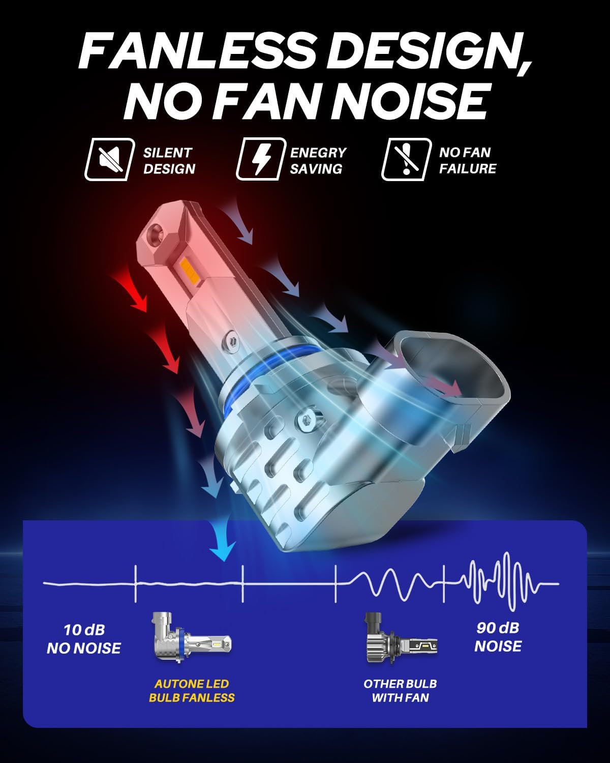 - Advanced and Ingenious Design: No plastic plug, won't detach from the plug or get loose compared to other 9005 fog light. Ensure AUTOONE 9005 hb3 led fog lights more reliable and durable. -Fanless design, no worry about the fan noise or fan’s out issue. Plus IP67 feature, avoid the dirt, wet inhale in driving. Those 9005 led light fog light/DRL will work perfectly on most severe weather