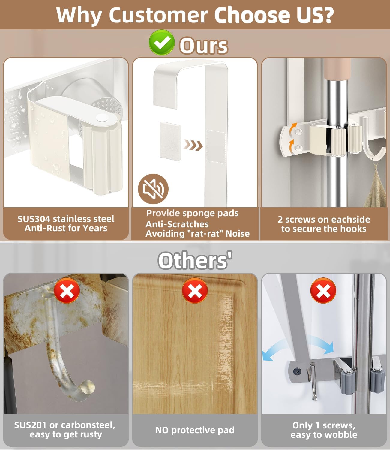 - 304 STAINLESS STEEL , ANTI-RUST & STURDY: The mop and broom holder wall mount is made of 304 stainless steel, making it corrosion-resistant, moisture-proof, and waterproof. Compared with plastic broom racks, it is stronger and more premium quality. This garage organization can hold up to 35 pounds when installed with screws, and the hook can also support your steam mop.
