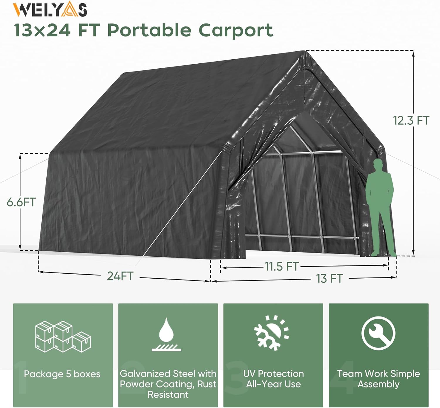 - 【Extra Large Carport】: The carport canopy is big enough.The carport's length, width and height dimensions are 24FT, 13FT and 12FT respectively, which can accommodate not only the Tesla CYBERTRUCK, but also various other cars and yachts;