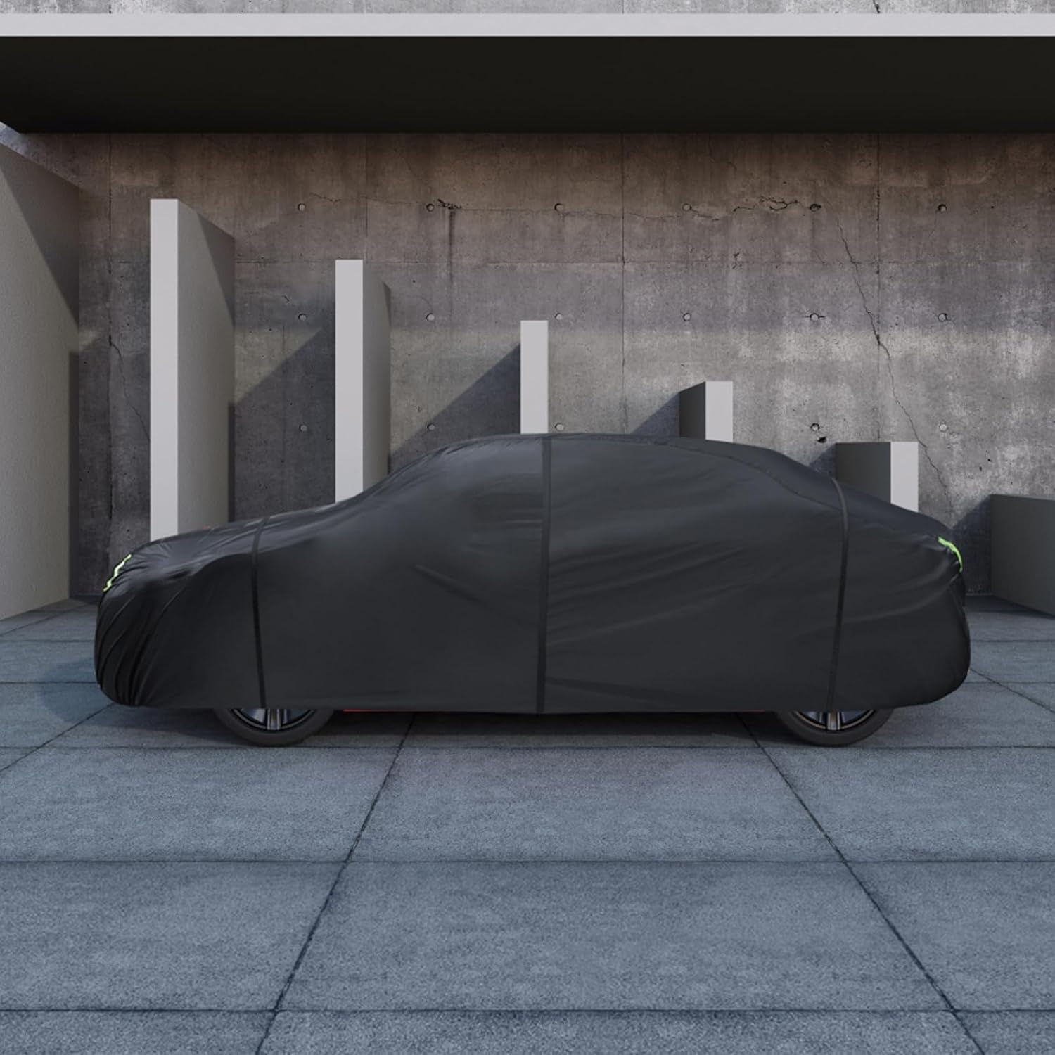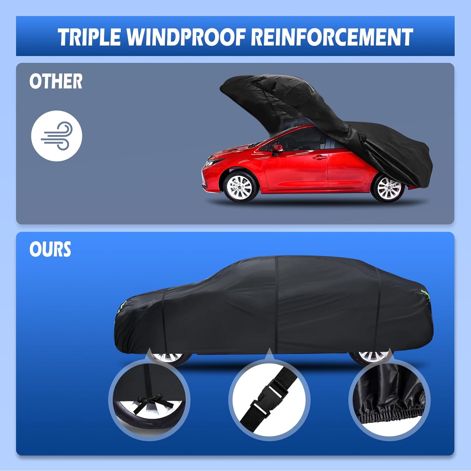 - ăWind-Resistant DesignăThe car cover waterproof all weather has been specially designed to resist strong winds. â Equipped with two bungee cords, which only take a few seconds to tie to the tires on both sides, it securely covers the front and rear of the car. ⥠There are specially designed windproof straps at the bottom to pass through the car's middle to ensure that the cover is not blown away. ⢠The adjustable elastic hem makes it easy to adjust the size and fix the cover to the car body.