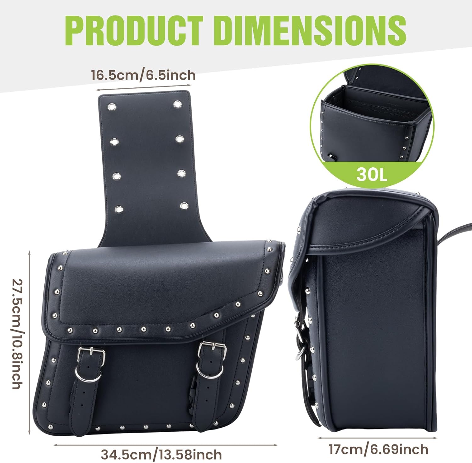 - 【30L Large Capacity】Motorcycle saddlebags size is 13.58 *6.69 *10.8 in. Enough room to store some regular stuff. Such as Cups, Drinks, Gloves, Jackets, Wallets, Earphones, Power Banks, Raincoats, Groceries, Tools, or other daily necessities to meet your demands for commuting and short vacations.