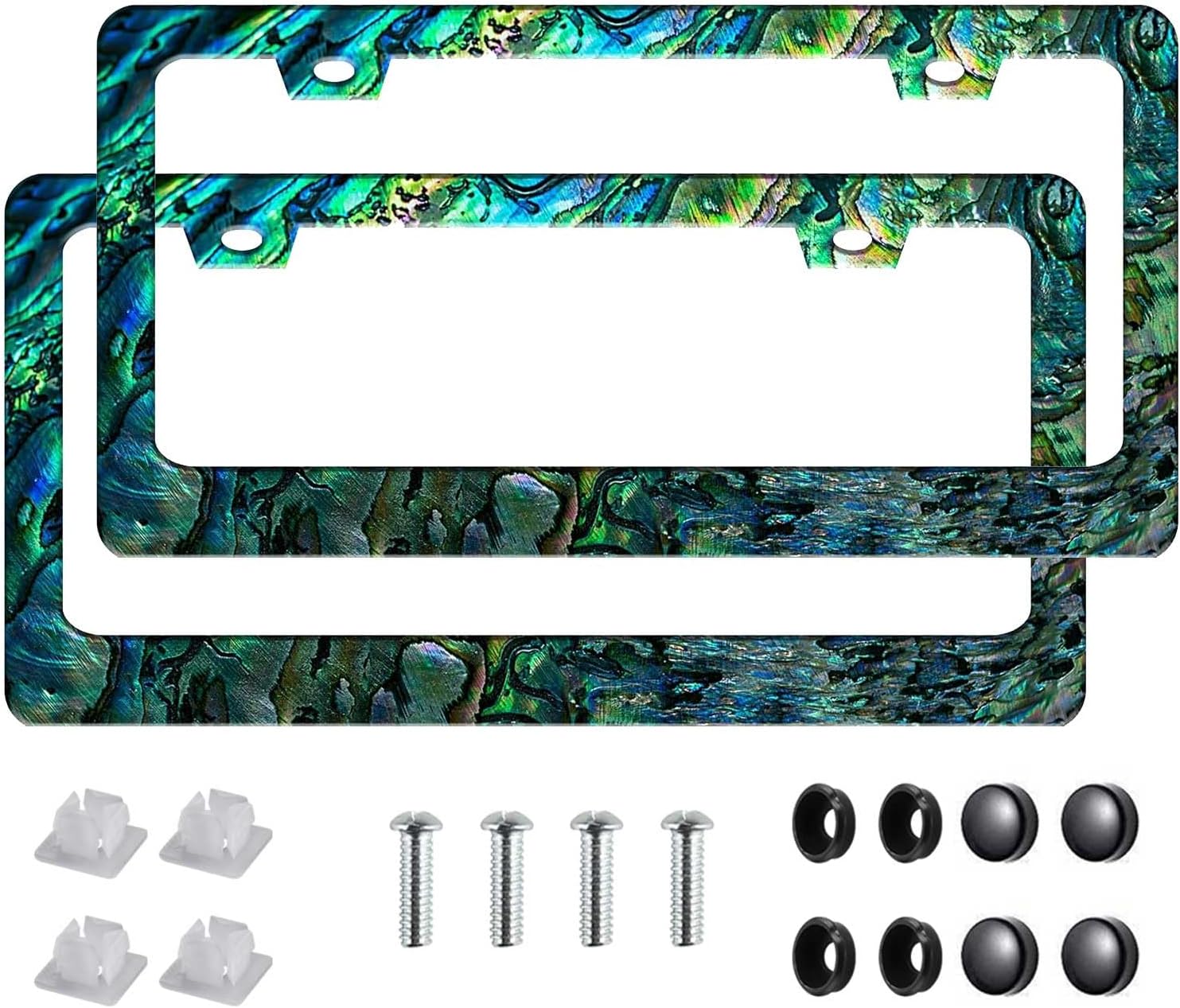 Universal License Plate Frame - Heavy Duty Rustproof Aluminum Matte Black Car Tag Holder Bracket Fits All US States, Easy Install with Screws Included (Faux Abalone-2pc)