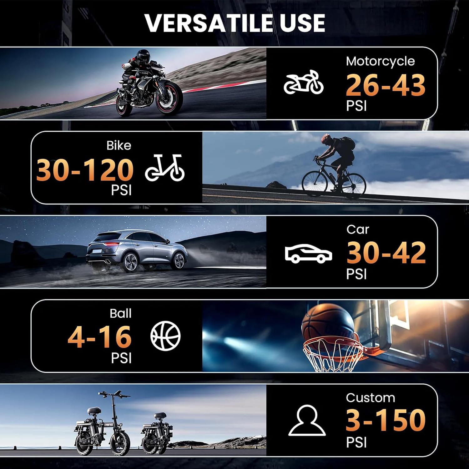 - 👍4 Inflator model:The Air Compressor has four pressure units: PSI, KPA, BAR, KG/CM², and four preset inflation modes for bike, motorcycle, car, and ball. You can freely set the pressure of the four preset modes according to your vehicle and ball up to 150 PSI.