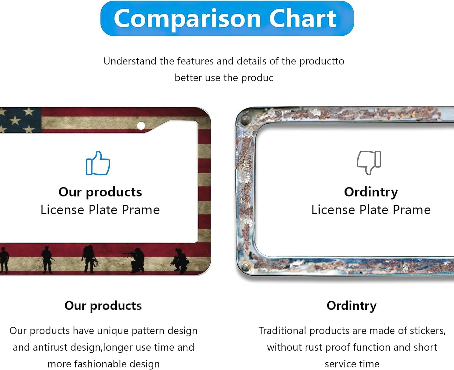 - ▶License Plate Frame Material: Our license plate frame is made of premium quality aluminum, which ensures that the plate frame will never wear out, corrosion resistant and non-fading. Even If license plate frames get dirty in the rainy season, it is easy to clean and can be applied for a long time. Personalized car frame can perfect to put on your front rear of car, decorate your car to make it look more beautiful and unique.