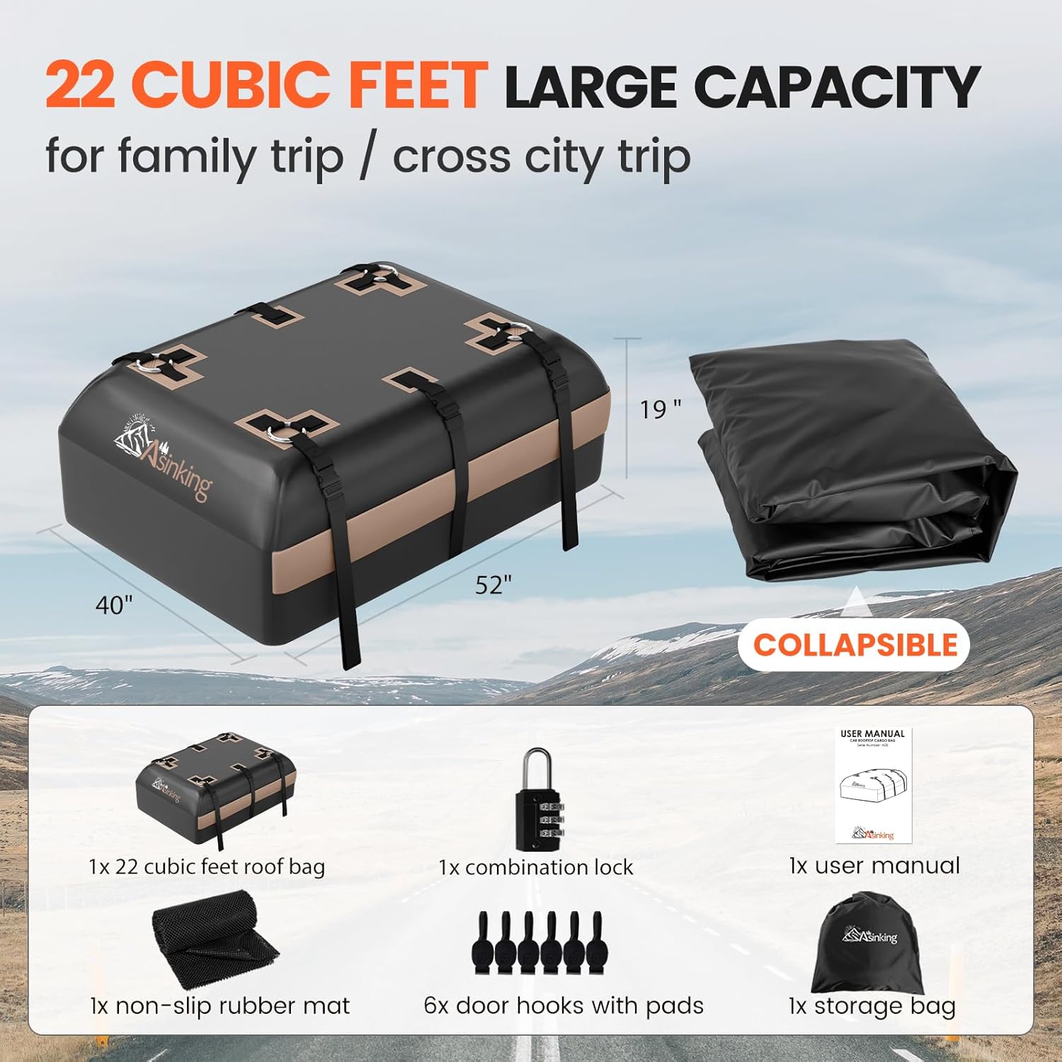- γππππΏππΎπ ππππγ1x 22 cubic feet Asinking Soft-shell rooftop cargo carrier bag(52"L x 40"W x 19"H), 1x non-slip mat, 1x combination lock, 6x door hooks, 1x storage bag, 1x user manual.