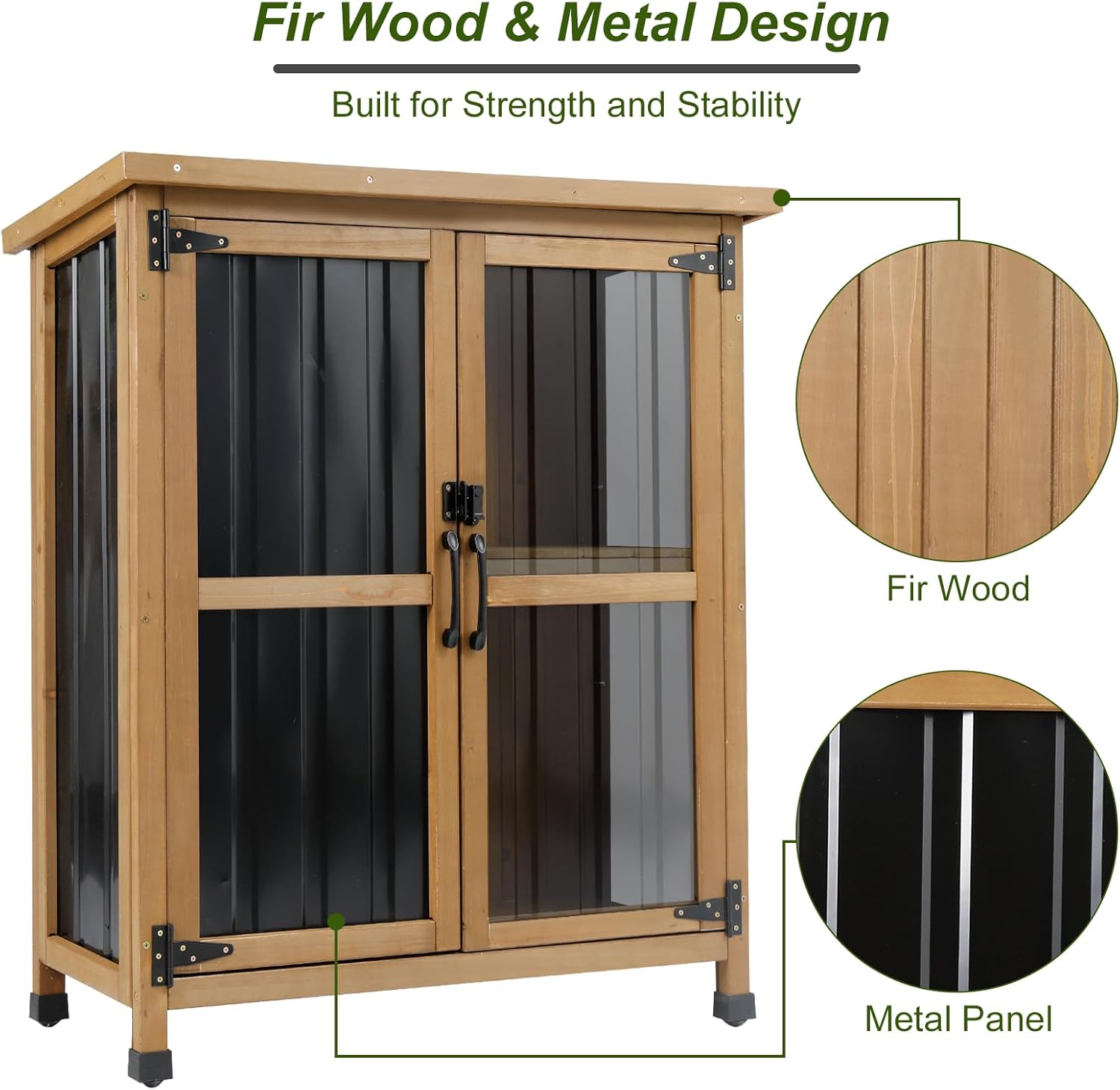 Outdoor Storage Cabinet Wood & Metal Small Storage Shed Waterproof Roof, Double Lockable Doors Garden Shed with Removable Shelves for Patio, Garden, Backyard, Lawn, 32" x 13" x 40" (Brown)