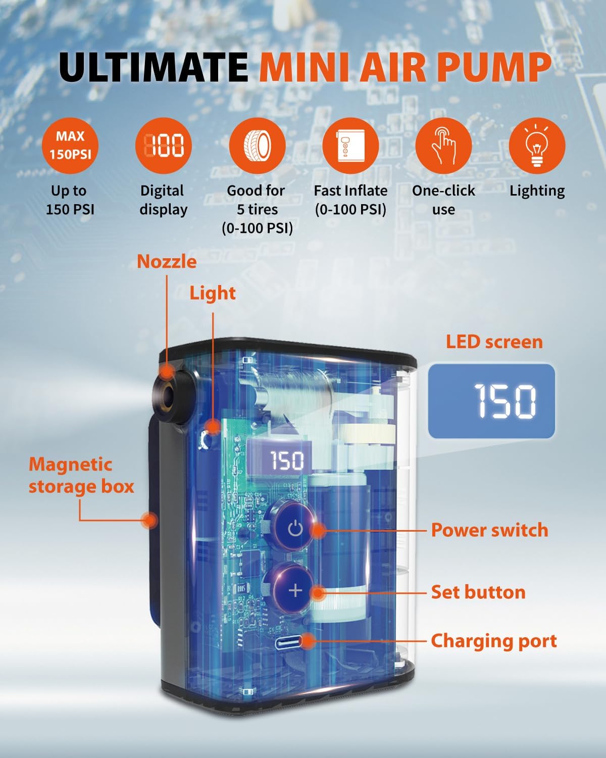 - Automatic Shutoff & Accurate Pressure Control – Equipped with a high-precision pressure sensor, the pump automatically stops inflating when the target PSI is reached, preventing over-inflation. The LED digital gauge displays real-time pressure readings with ±0.5 PSI accuracy.