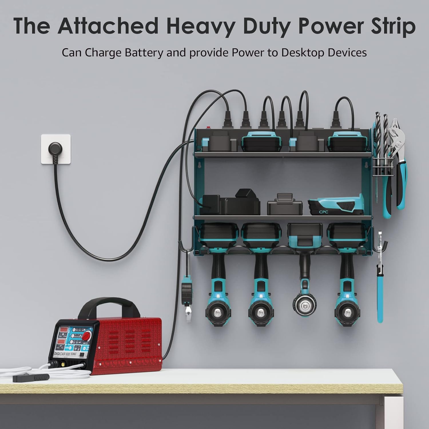 - Power tool organizer with charging station, come with 8 outlets. If you have a lot of rechargeable tools, you can charge everything right in the rack and avoid searching for sockets. 6ft power cord included.