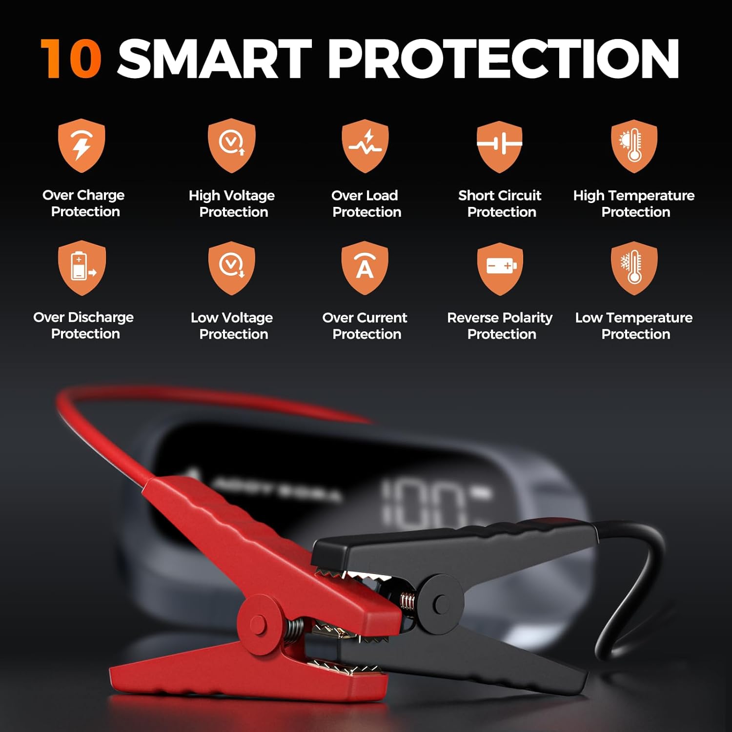- ă10 Smart Safety ProtectionsăAOOYSORA Jump Starter Power Bank built in 10 different types of protections, which can effectively prevent overcharging, short circuit, reverse connection and sparks, making it very safe to use.The smart jumper cable is designed with durable all-metal clips to prevent possible damage from long-term use.