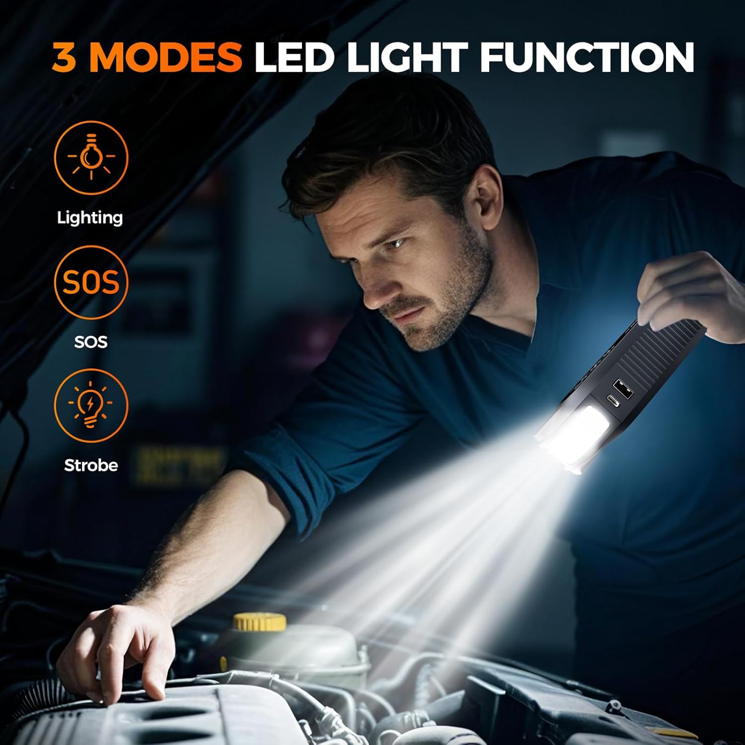- ăMore Than Just a Car Jump StarterăThe N1 Jump Starter Battery Pack can also be used as a 16000mAh power bank, equipped with 1 USB output port and 1 Type-C input/output port, which can charge your smartphone or other electronic devices at the same time. The built-in 400LM LED light has 3 modes: flashlight, strobe light and SOS, which is very useful in the dark or emergency, and is a perfect car emergency kit.