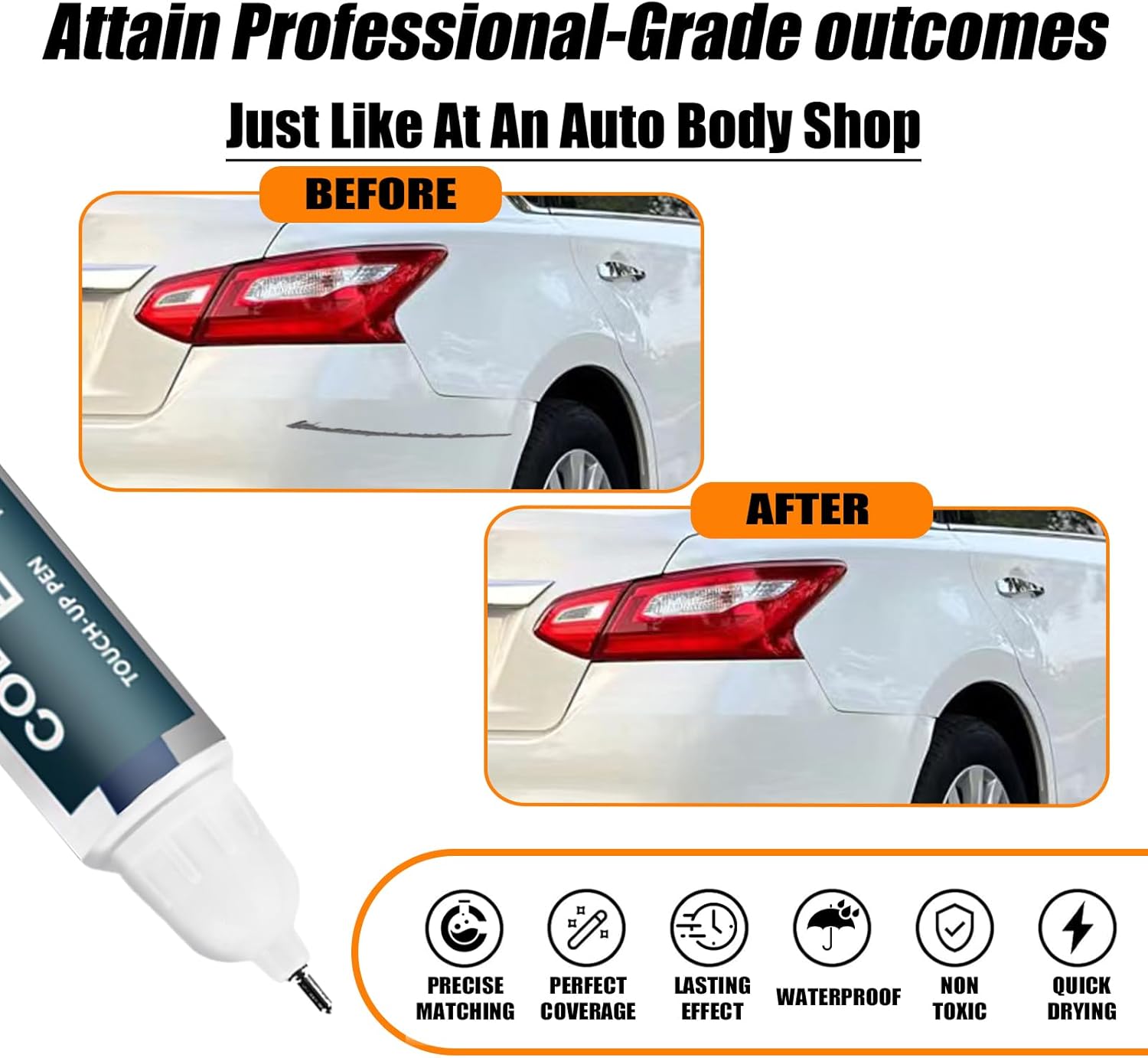 - ăRepair scratches quickly and simplyăThis car scratch repair paint has strong adhesion, anti-rust, and waterproof properties that protect your car's surface from further damage. With a 2-in-1 uses design, each bottle of car paint comes with a pen pin and brush, ensuring a hassle-free application