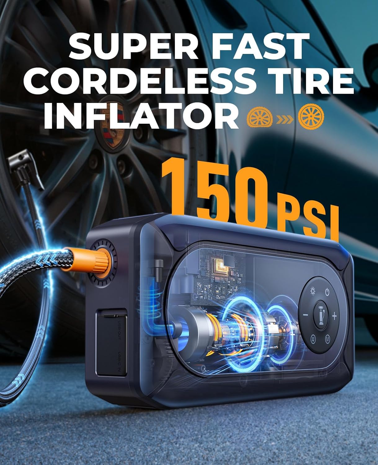 - â€ă5+4+3 150 PSI FAST INFLATOR & 3.3" LCD DISPLAYă Easy to use, smart preset, pressure detection & auto shut-off. With high turbo 35L/Min (150PSI) lasting 25 minutes, the portable car jump starter with air compressor fills a flat tire to 20 PSI in just 2 mins. 5 inflation modes, 4 different nozzles, 3 optional units and and extended air tubes for wide applications (cars, motorcycle, bikes, balls, etc). Large 3.3-inch screen, viewable in sunlight, reads tire pressure in real time with ±1 PSI accuracy.