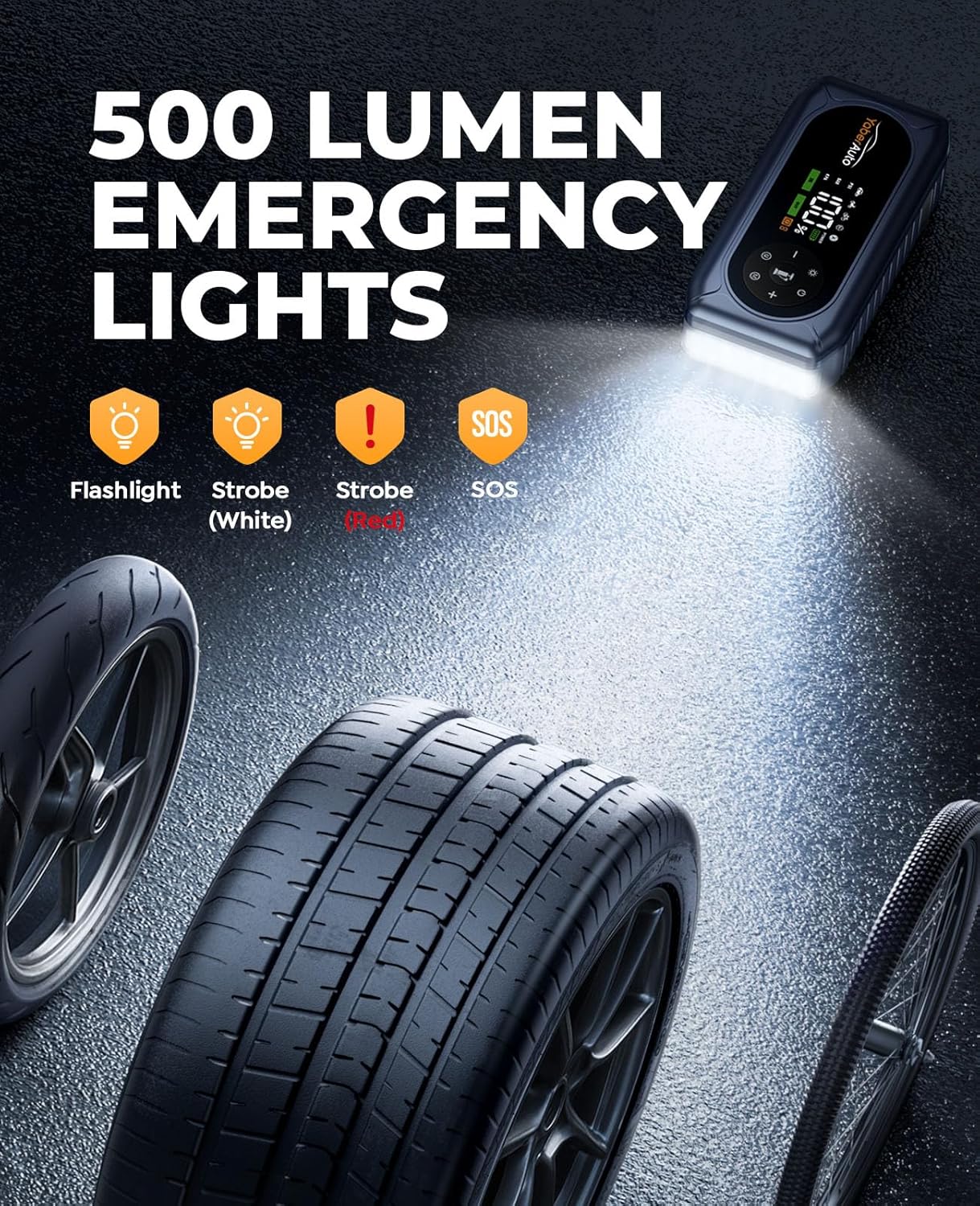 - â€ă 9-IN-1 ALL-ROUND JUMP STARTER ă 2025 All-in-One jump box transcending general jump starters! This lithium battery jump starter highlights 9 premium functions to meet all your needs! It's a car battery jumper starter portable, tire inflator, pressure gauge, portable power bank, 4-mode lights (flashlight, strobe, warning, SOS) , 18W USB charging and 400V Insulated Gloves. Portable, versatile and must-have emergency roadside kit.