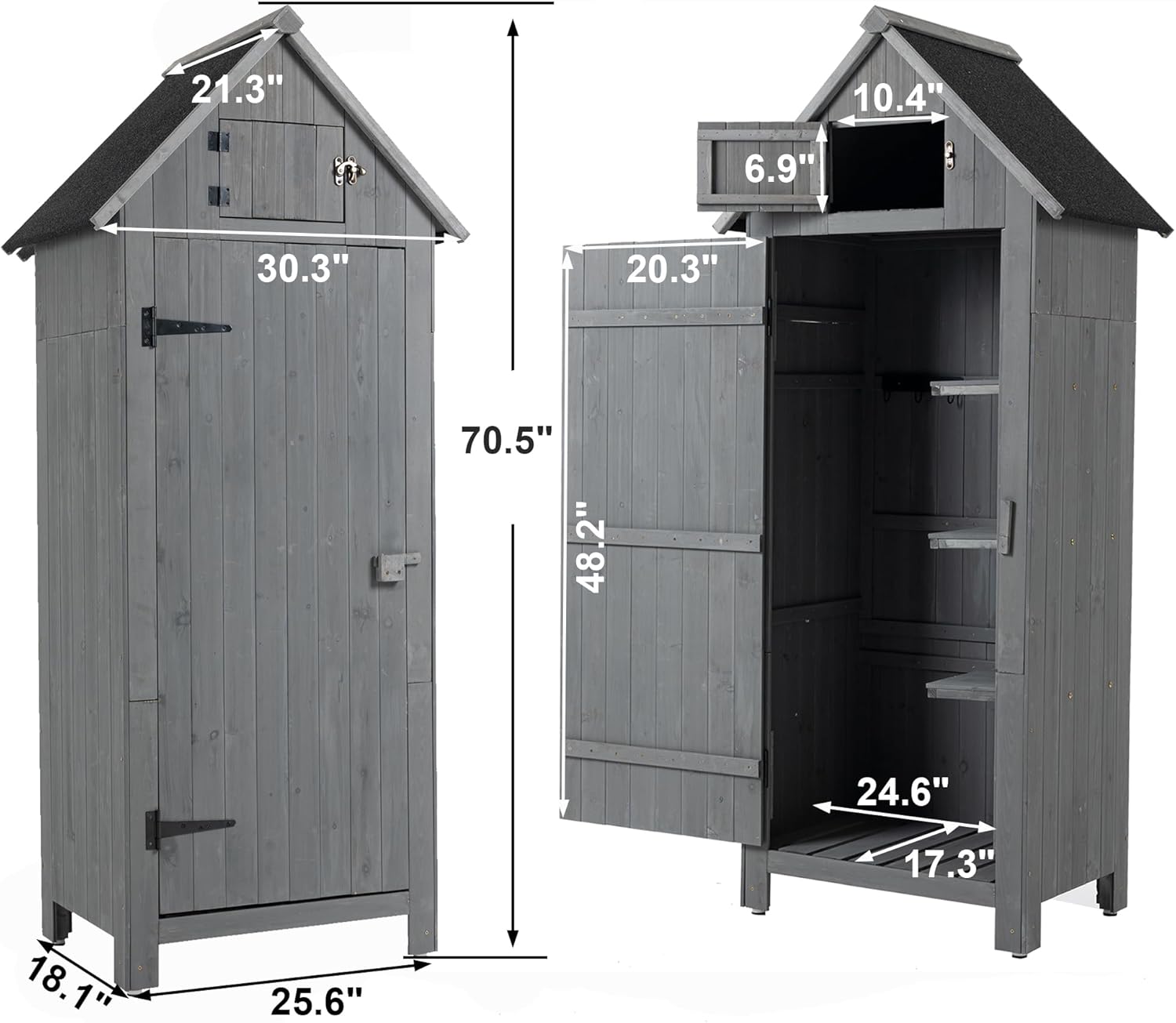 30.3" L X 21.3" W X 70.5" H Outdoor Storage Shed with Waterproof Roof, Solid Fir Wood Frame, and 3 Compartments for Garden Tools, Mower, and Hose,Grey
