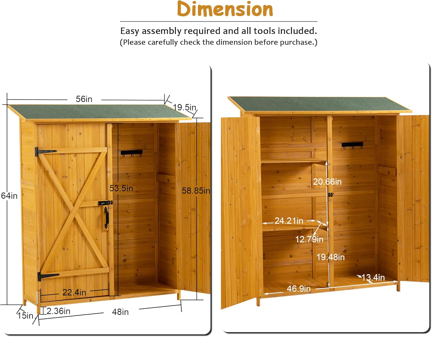 - DURABLE FIR WOOD CONSTRUCTION - Built with 100% fir wood and reinforced with metal handles, hinges, and latches, this natural wood outdoor storage shed ensures long-lasting durability and resistance to wear and tear.