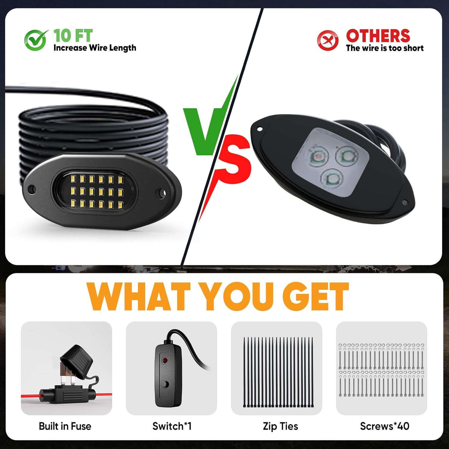- ăIP68 WaterproofăMade from high-quality, IP68 waterproof, and dust proof materials, these white rock lights for trucks are built to withstand harsh weather conditions, ensuring long-lasting performance