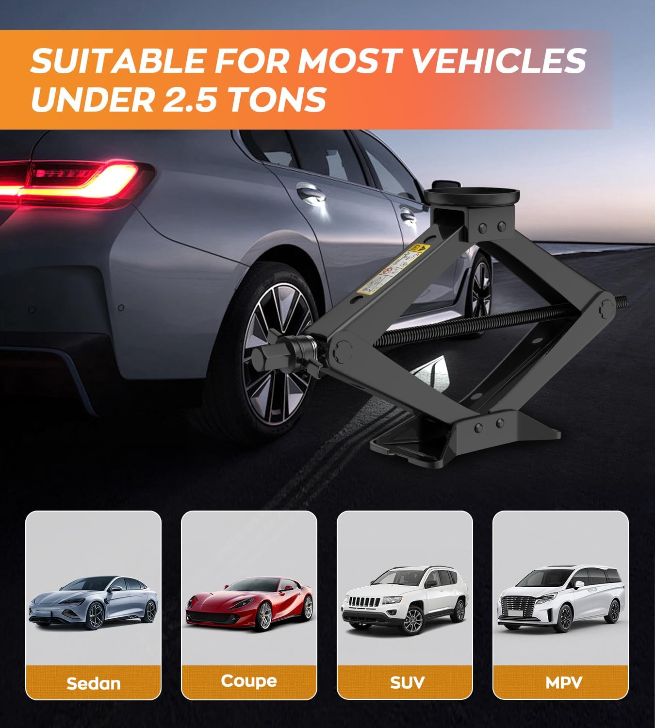 - Compatible with most vehicles - This multifunctional car scissor jack is compatible with various circular jack pads and is suitable for Sedan, SUV, MPV, etc