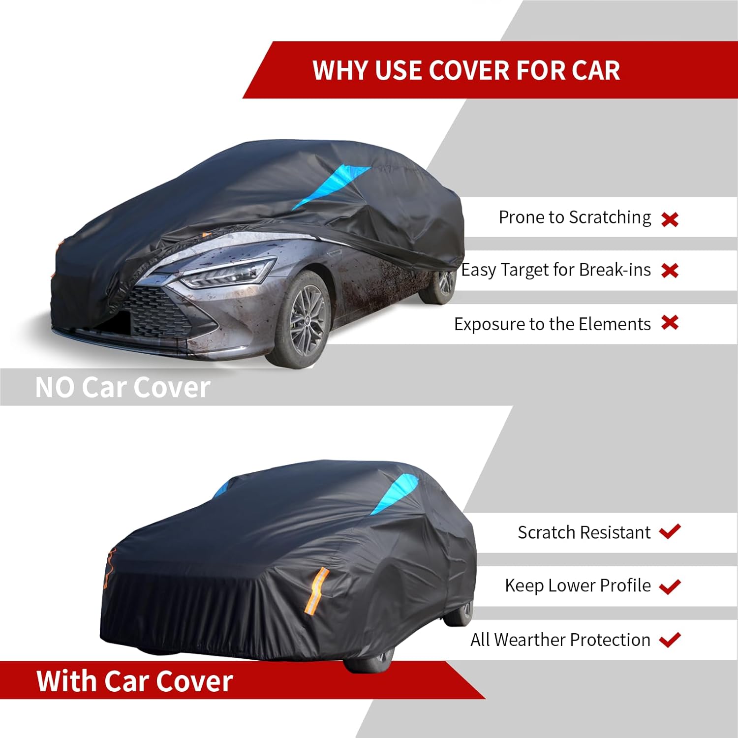 - Thoughtful Design: Our car covers have a driver door zipper for easy access. And the cover with four wind stripes can completely cover and stick to the car body to avoid being easily blown away by the wind. Then the reflective strips provide night visibility, and your car's contour can be easily seen and avoid accidents