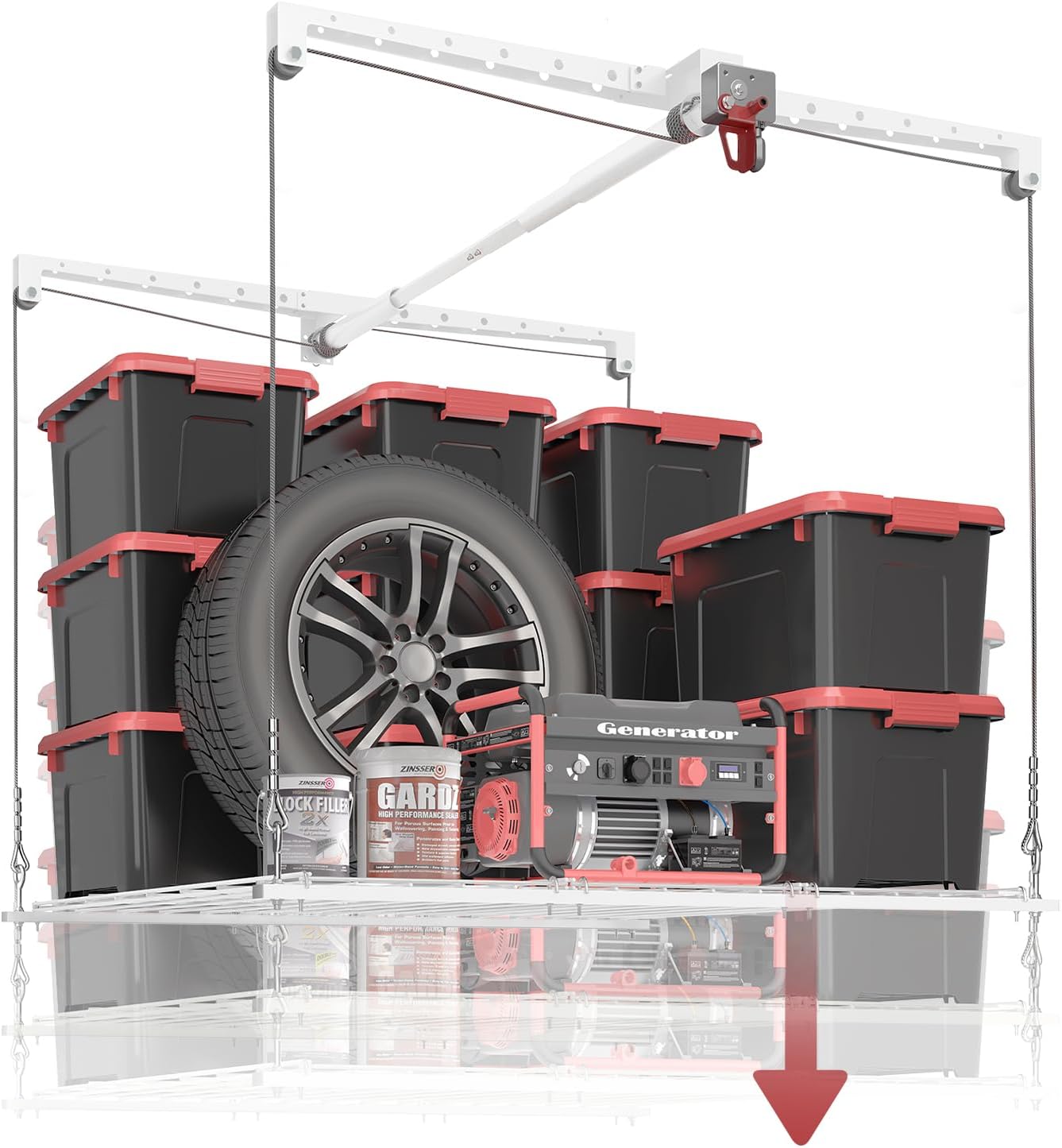 - Innovative Design for Easy Access: Elevate your garage organization with this overhead garage storage lift. Unlike traditional garage storage shelves, our product allows for effortless access, making storing and retrieving items a breeze, without the need for ladders.