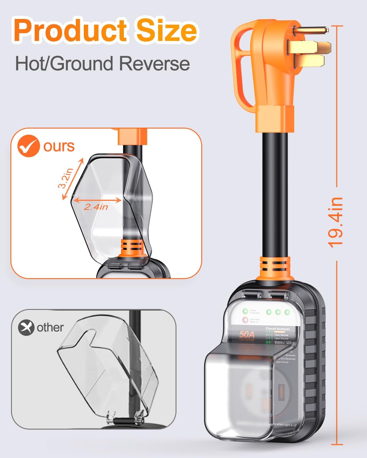 GEARGO RV Surge Protector 50 Amp, Latest 18000J Surge Protection RV Circuit Analyzer, RV Adapter Plug for Camper with Waterpoof Cover, Plug and Play(Orange)