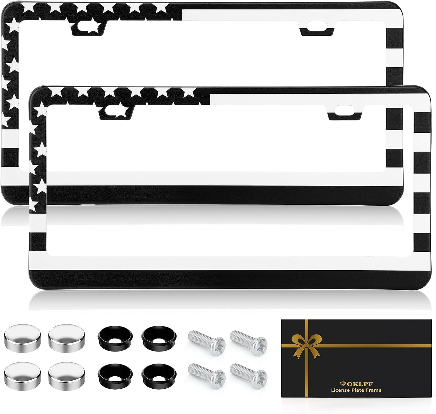 OKLPF Premium American Flag License Plate Frame, Black License Plate Frame, Black Aluminum License Plate Cover, Matte License Plate Front and Rear 2 Packs. (2 Holes), Come with Screw Cap, Screw,Washer