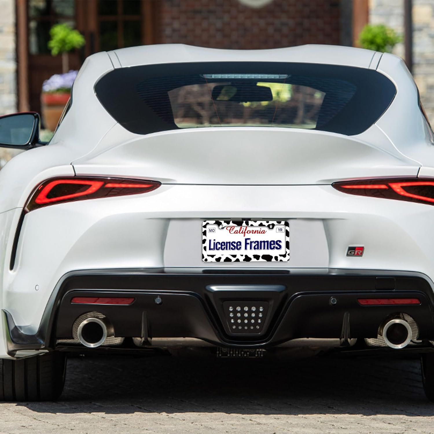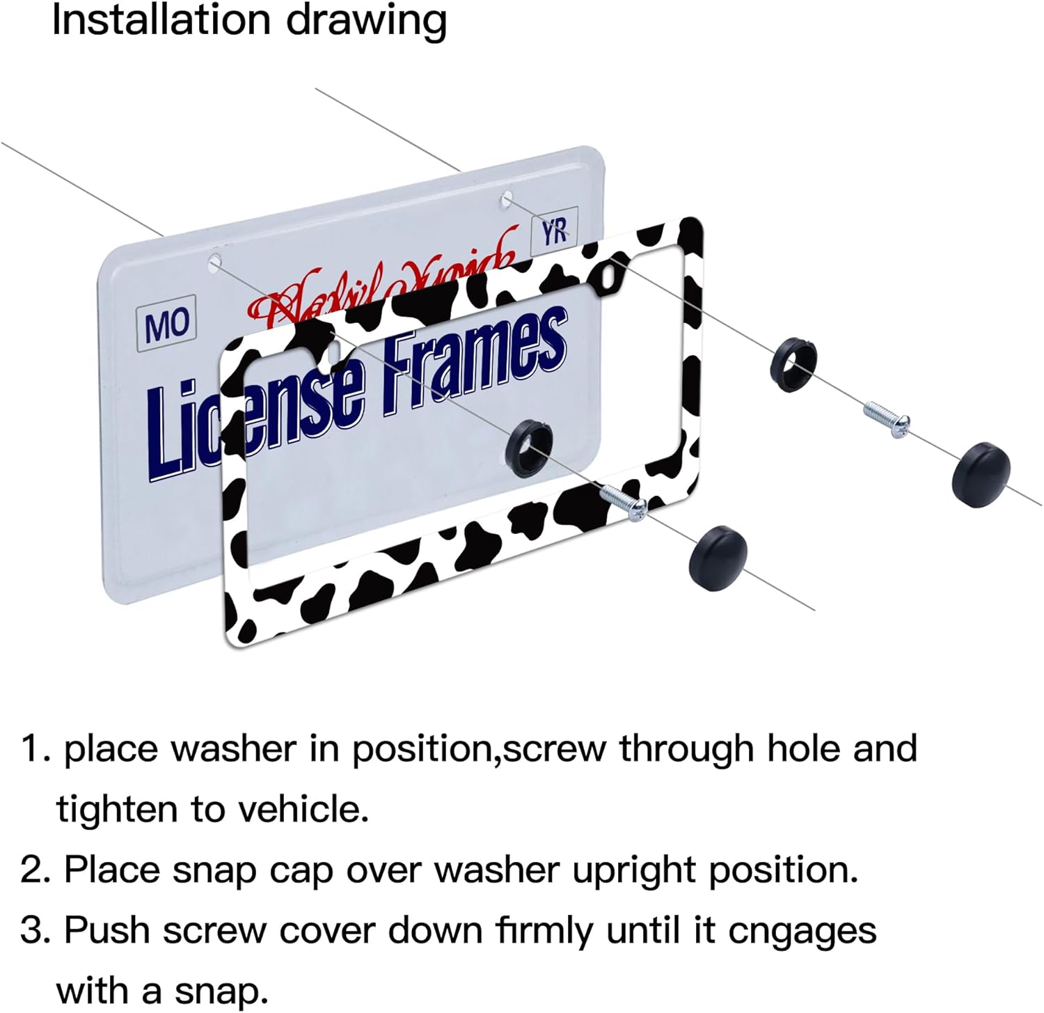 - License Plate frames Cow Print Stuff Set:You will receive a set of 2 license plate frames,All Accessories Needed are Included (4 Screw Caps,4 Screws,4 Washers),Quick and Simple Installation,you don’t need to buy any other hardware or fasteners,Anti-theft caps are also included.