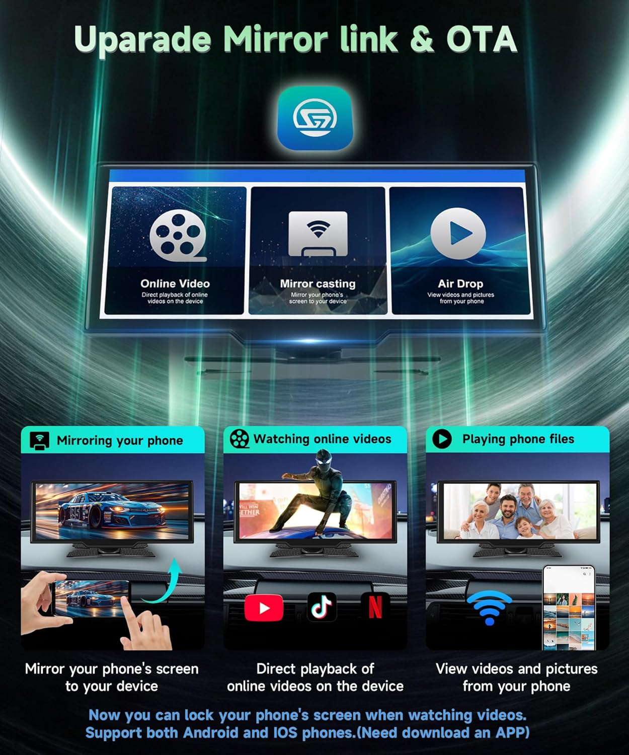 - Upgrade Mirrorlink and OTA: The upgrade screen mirror function allows you to watch Youtube, Netflix, Tiktok etc from the screen by mirroring your phone's screen by connecting to internal wifi on the device through "Super Link" (not recommended while driving).Get the latest features and fixes wirelessly with OTA updates. Your car radio stays up-to-date automatically. Enjoy better performance and new functions on the go!