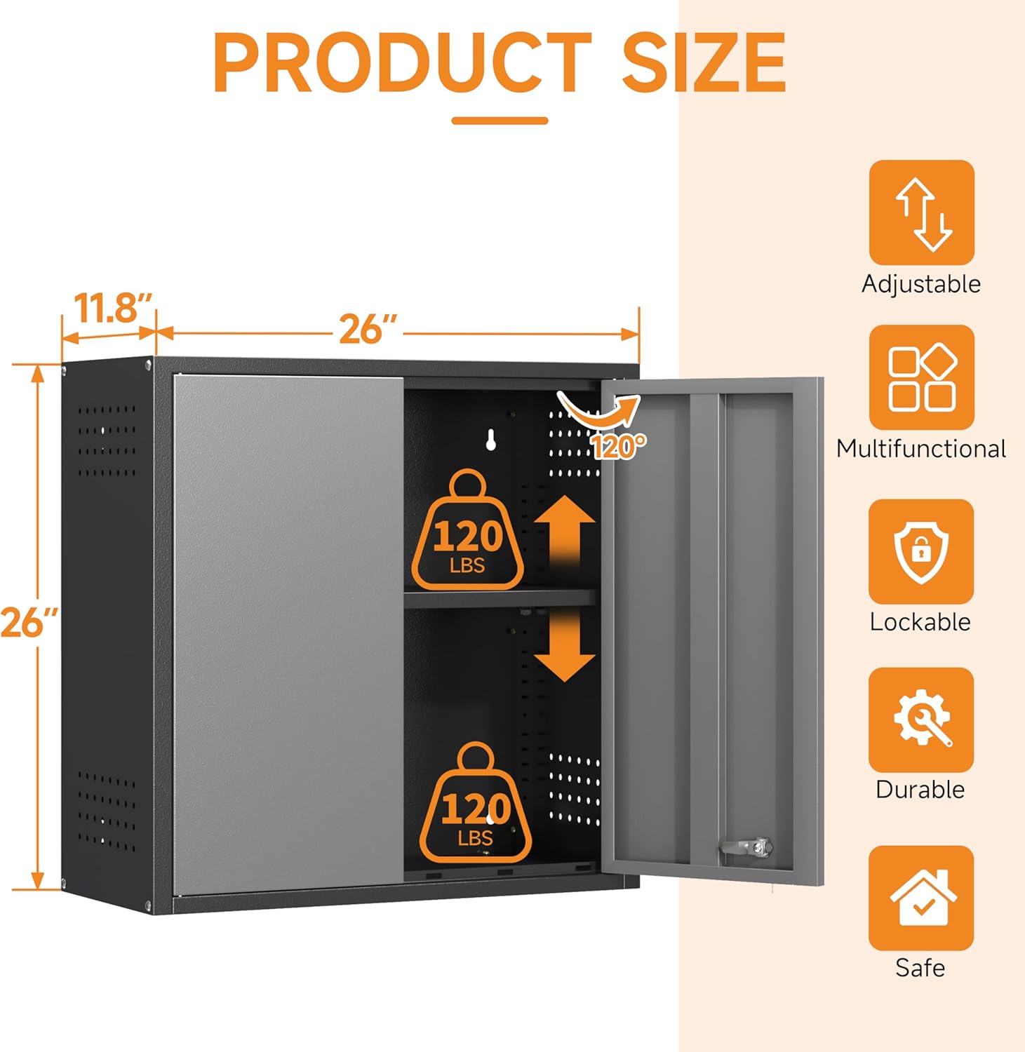 Metal Garage Wall Cabinet with 2 Doors and 1 Adjustable Shelf,Lockable Floating Tool Cabinet with Pegboard,Steel Storage Cabinet for Kitchen,Office,Garage,Laundry,Warehouse(Black&Gray, 26"H)