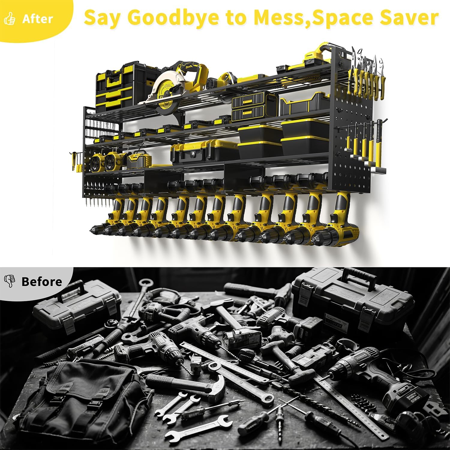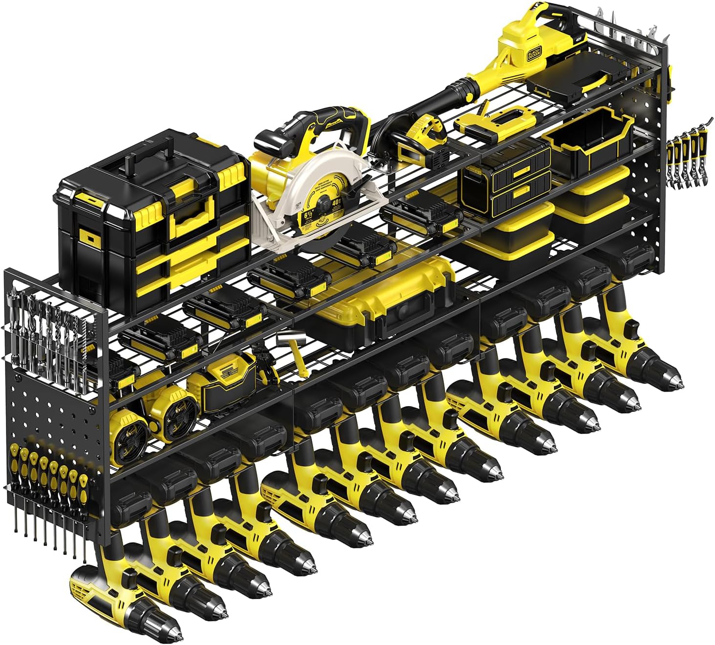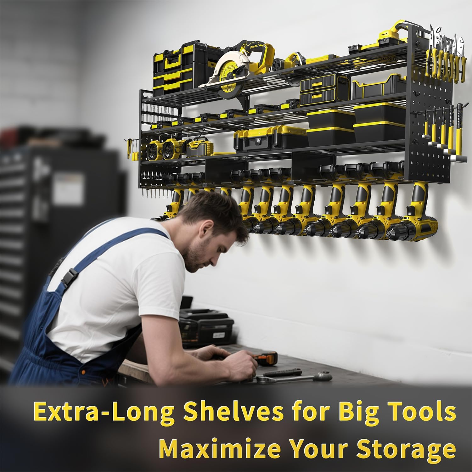 - đȘă52.4" Large 4-Tier Power Tool Organizer with 12 Drills Holderă This power tool organizer wall mount features a 4-tier structure with a total length of 52.4 inches. Store up to 12 drills on the bottom tier, with spacious compartments above for batteries, toolboxes, hammers, angle grinders, heat guns, and more. Ideal for keeping every tool within reach and your garage clutter-free.