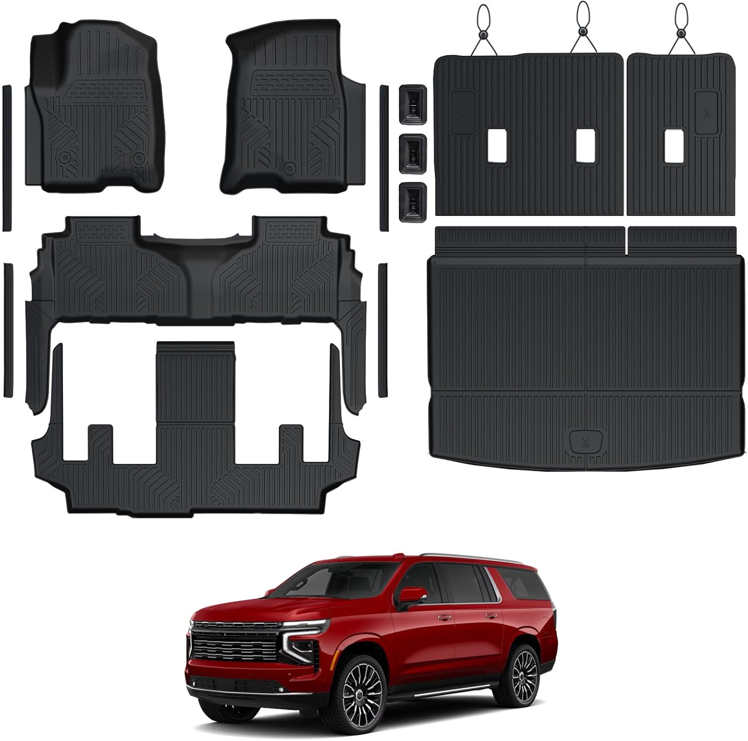 - Custom Fitment: Precisely engineered with 3D laser scanning for 2021 2022 2023 2024 2025 Chevy Suburban / GMC Yukon XL with 7-passenger seating (2nd-row Captain's Chairs). Includes floor mats, cargo liner, 3rd row seat back protectors, 4PCS door sill guards – 30% more components than standard sets