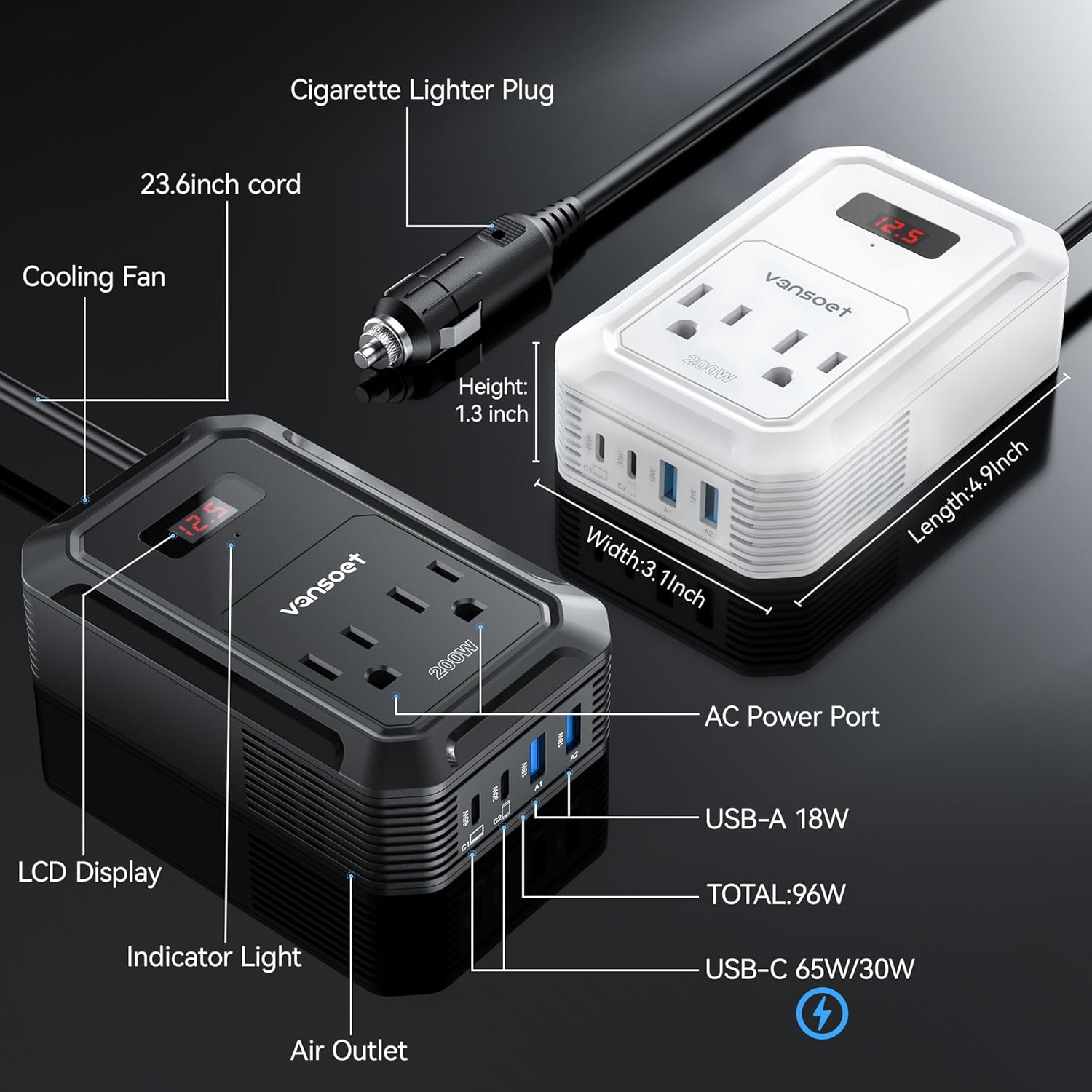 - Vansoet Advantage: America's leading power inverter brand. Provides 200 Watts continuous DC 12v to AC 110v power inverter featuring 2xPD (65W/30W)&2xQC 18W USB ports, 2 AC outlets, and a 23.8-inch cable with cigarette lighter plug and LCD Display for you, more convenient.