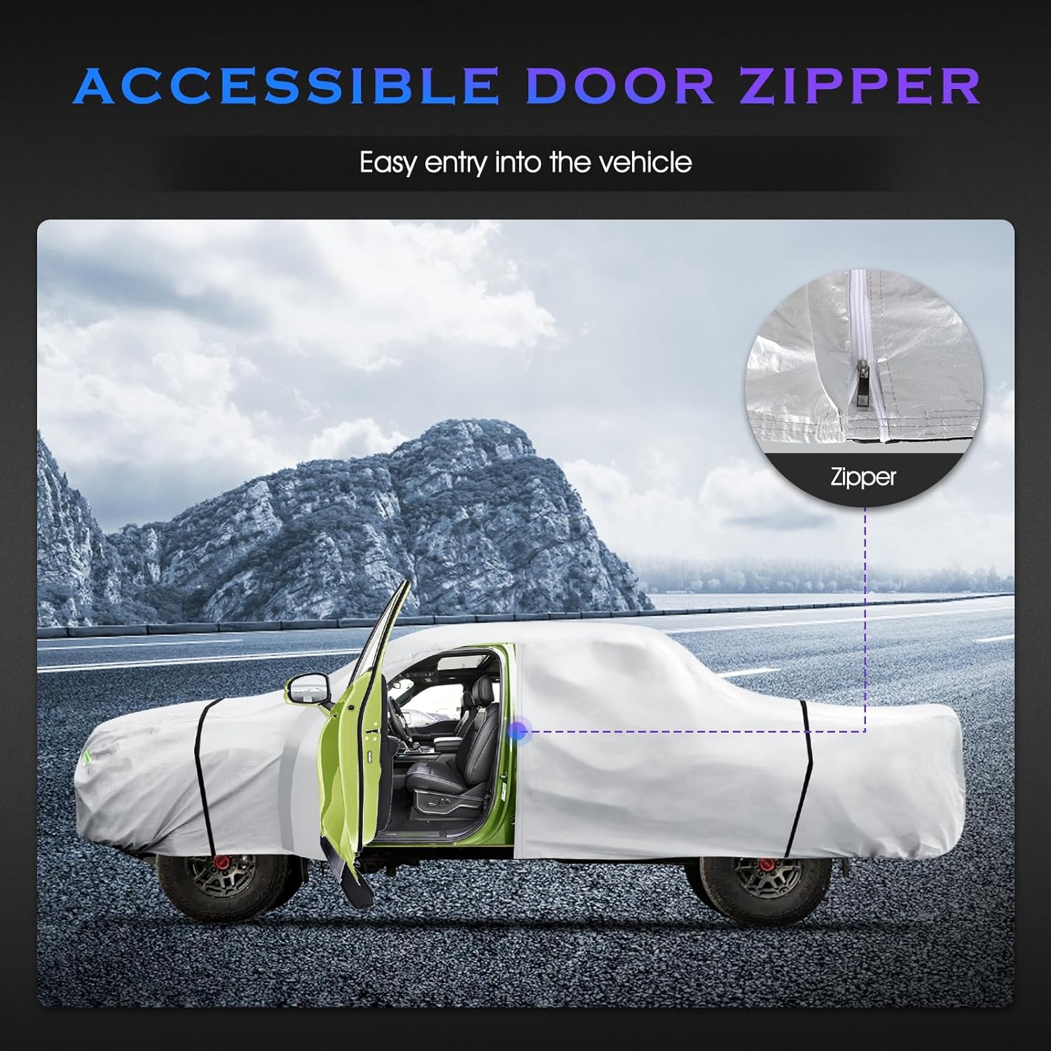 - 【100% Waterproof all weather Protection】: Durable weather-proof materials and heavy-duty reinforced stitching combine with Qualencey’s custom-like fit guarantee to produce a cover that is waterproof, windproof, snowproof, dustproof, 100% sun and UV protective, and scratch resistant ;Protects your truck from UV rays, dust, snow, branches, bird droppings, leaves, pollens, rain, sand, and more. Perfect for use in all seasons, whether parked indoors or outdoors;Triple windproof reinforcement :Elastic stretch,band Wheel strap,Windproof strip