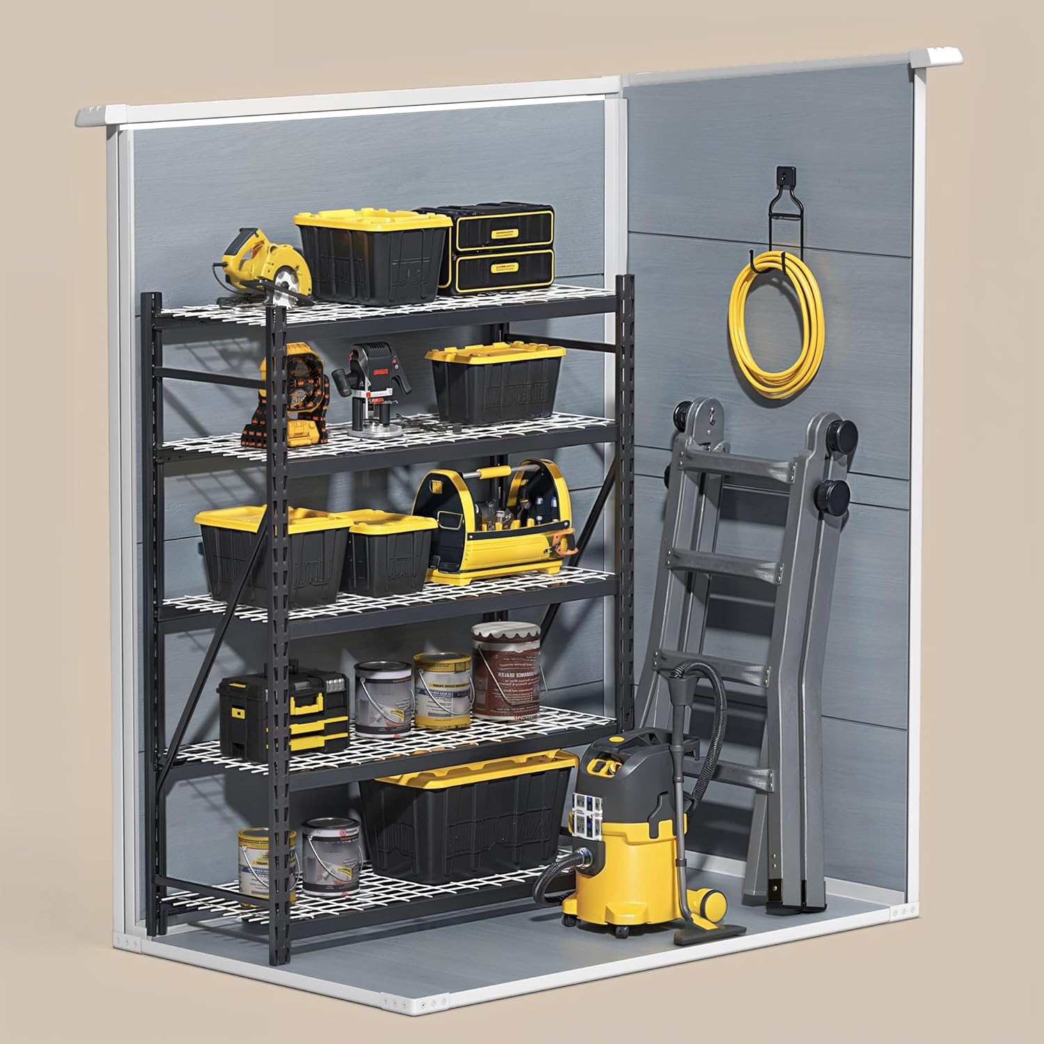 - Durable Materials: This resin shed features a sturdy floor, completely protecting it from ground moisture. Resistant to corrosion, water, rust, UV rays, bending, and puncturing, resin sheds are safe to use in all weather conditions, making them ideal outdoor storage sheds for storing tools, bicycles, and seasonal items