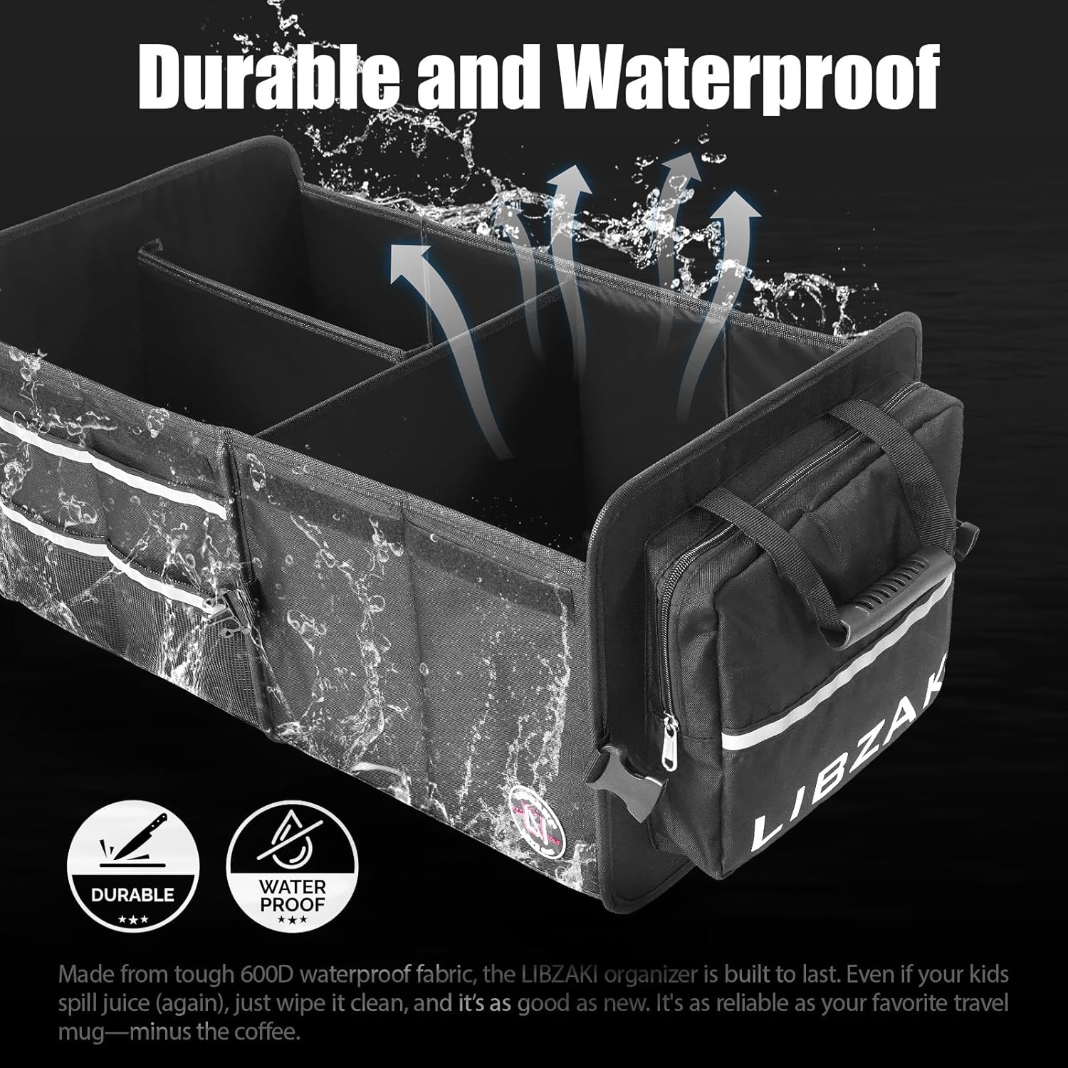 - Rugged Car Storage Organizer Built to Last Engineered for heavy-duty use! Both sizes feature ​600D tear-resistant Oxford fabric + reinforced base, making this ​trunk organizer for car waterproof and crush-proof. Safely holds ​66 lbs of cargo without sagging – from car accessories to emergency kits.